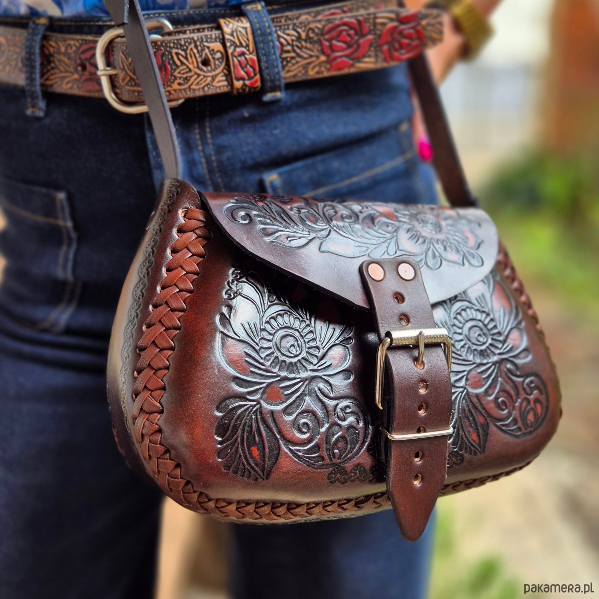 Torebka Folklora to unikatowy dodatek, który łączy w sobie tradycję rzemiosła i nowoczesny design. Wykonana ręcznie z grubej skóry naturalnej, charakteryzuje się wyjątkową trwałością i elegancją. Jej powierzchnię zdobią misterne wzory w kształcie kwiatów, które nadają torebce artystycznego wyrazu i nawiązują do folklorystycznych motywów. Dzięki dużej przestrzeni w środku Folklora jest idealna na co dzień, łącząc funkcjonalność z niepowtarzalnym stylem. Każdy egzemplarz jest jedyny w swoim rodzaju, co czyni ją idealnym wyborem dla osób ceniących oryginalność i rękodzieło.