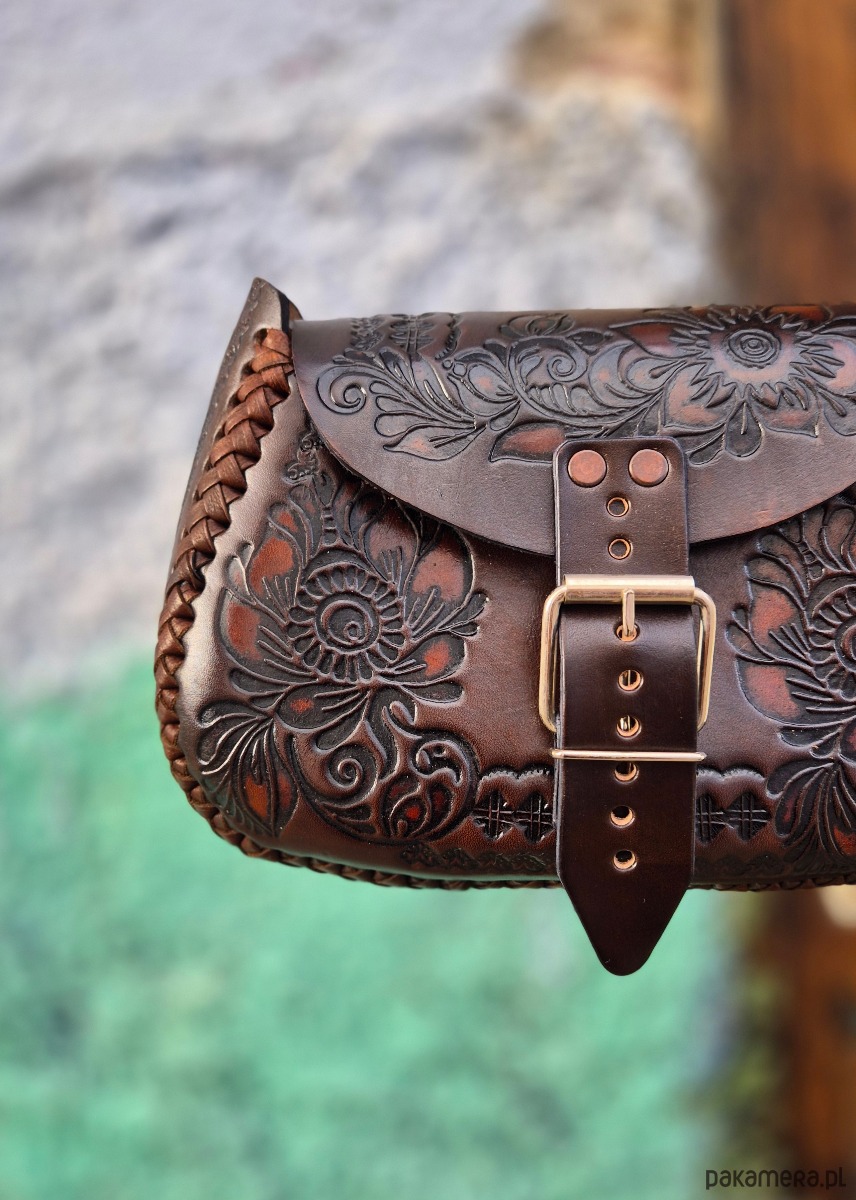 Skóra użyta to wykonania torebki jest ręcznie garbowana, wzory wykonane są za pomocą odpowiedniego ręcznego stempla, a następnie malowane.
