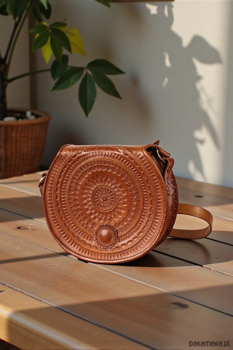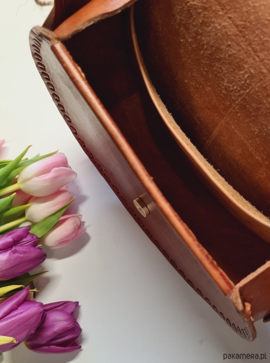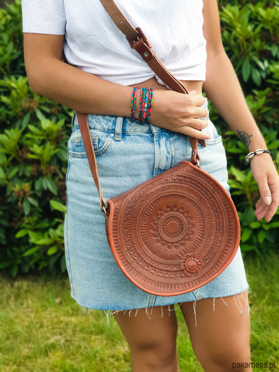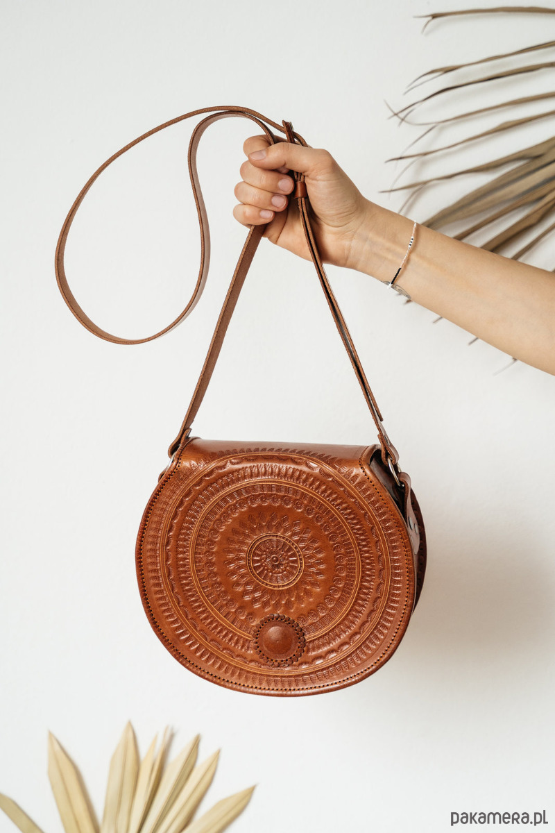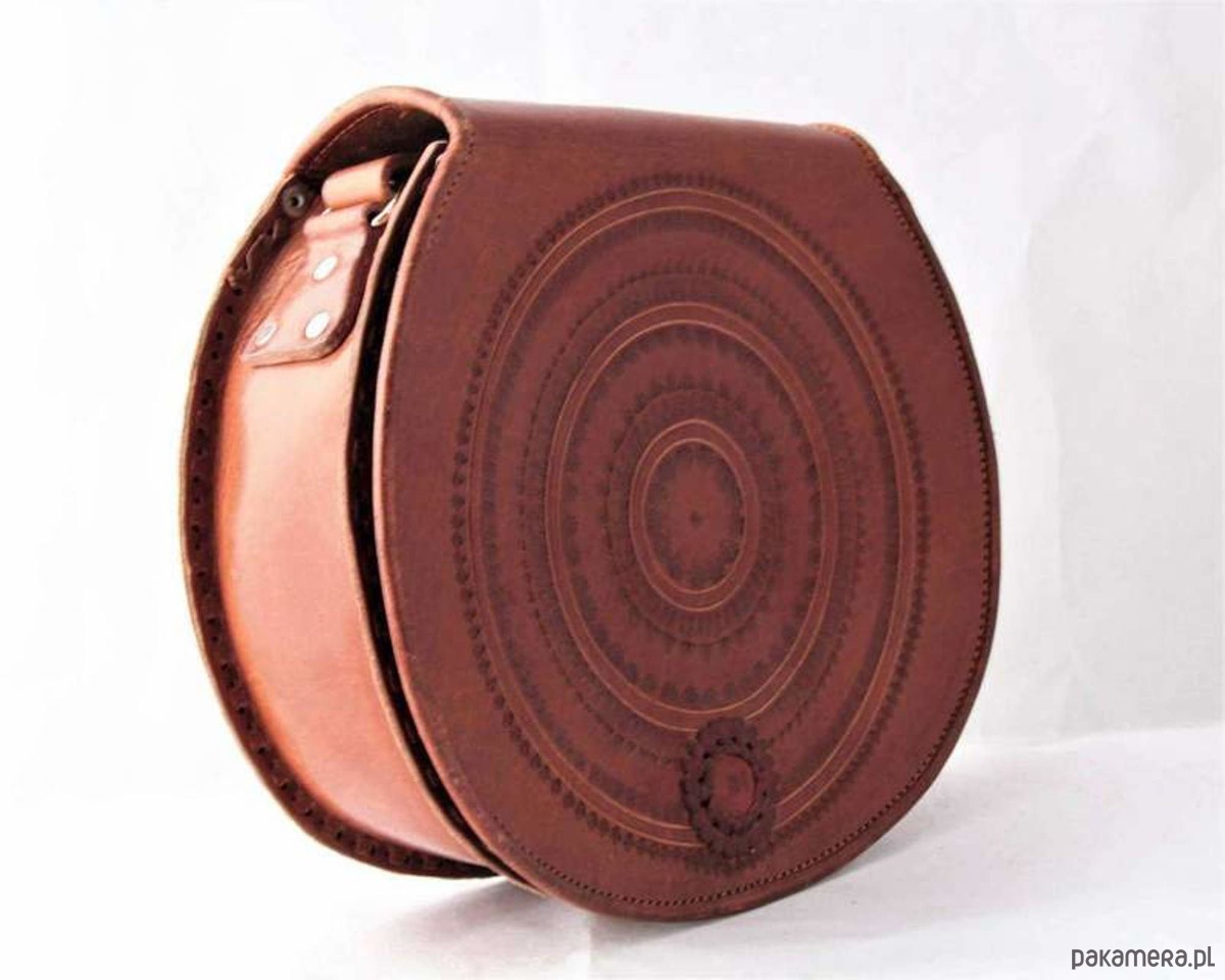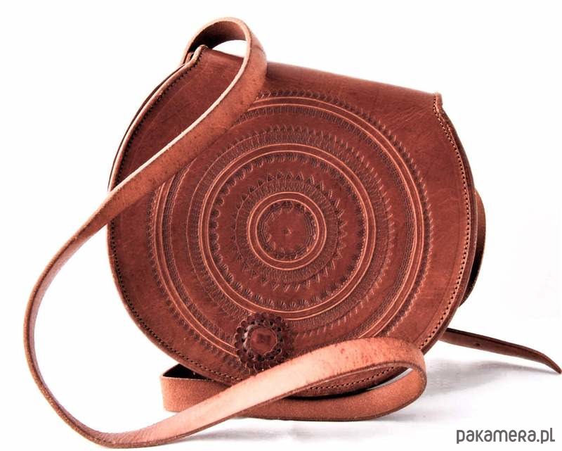 Duża, okrągła i niemniej urocza torebka - listonoszka. Starannie wykonana ze skóry naturalnej, zdobiona pięknymi ręcznie tłoczonymi wzorami, które sprawiają, że jak każda nasza torebka, jest unikatem. Torebka zapinana jest na magnez. Mieści aparat fotograficzny oraz najpotrzebniejsze kobiece rzeczy.