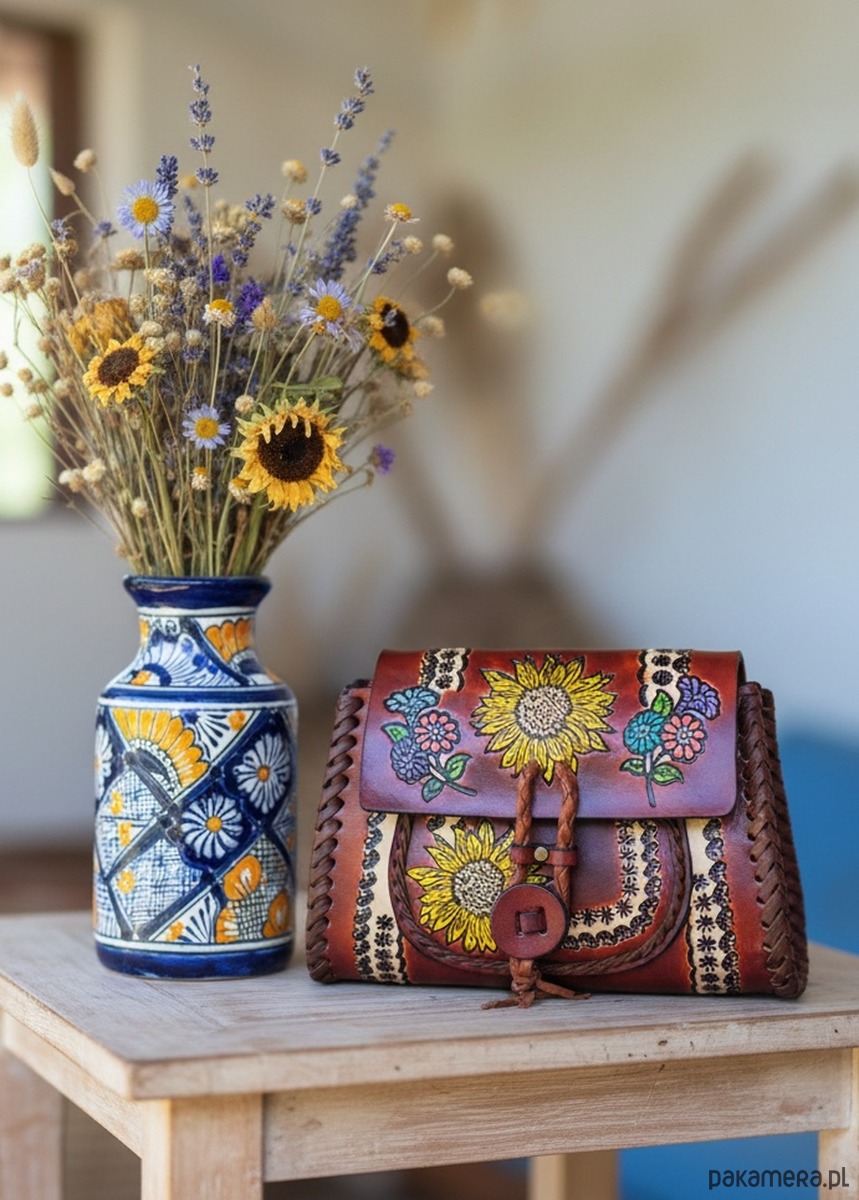 Skórzana torebka, ręcznie wykonana w Meksyku z grubej skóry naturalnej. Jej unikalny design zdobią wzory z motywem kwiatowym, które nadają jej niepowtarzalny styl i charakter. Każdy detal torebki został starannie wykonany przez doświadczonych rzemieślników, co sprawia, że jest ona nie tylko pięknym, ale także trwałym dodatkiem do garderoby. Wykorzystanie skóry naturalnej gwarantuje, że torebka będzie służyć przez wiele lat, zachowując swój wyjątkowy wygląd. Jej elegancki design sprawia, że doskonale sprawdzi się jako dodatek zarówno do codziennych stylizacji, jak i na wyjątkowe okazje. Ta torebka to nie tylko praktyczny element garderoby, ale również wyraz artystycznego kunsztu meksykańskich rzemieślników, którzy tworząc ją, przelewają w nią swoją pasję i tradycje.