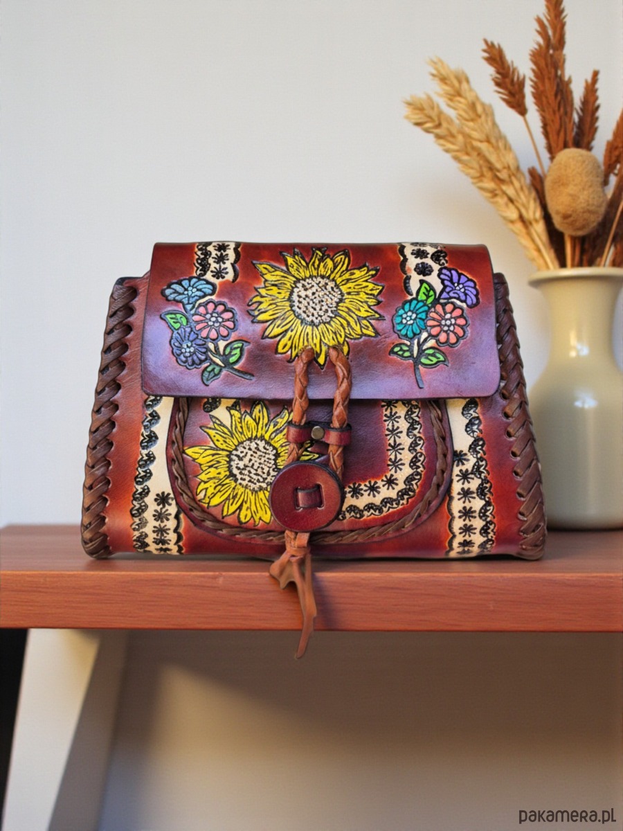 Skóra użyta to wykonania torebki jest ręcznie garbowana oraz ręcznie malowana, a wzory wykonane są za pomocą odpowiednich stempli.