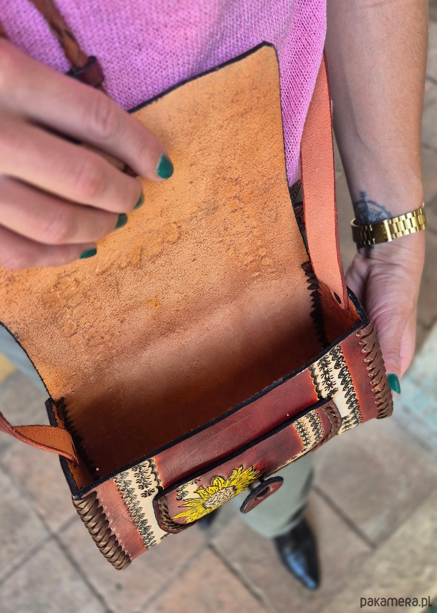 Skórzana torebka, ręcznie wykonana w Meksyku z grubej skóry naturalnej. Jej unikalny design zdobią wzory z motywem kwiatowym, które nadają jej niepowtarzalny styl i charakter. Każdy detal torebki został starannie wykonany przez doświadczonych rzemieślników, co sprawia, że jest ona nie tylko pięknym, ale także trwałym dodatkiem do garderoby. Wykorzystanie skóry naturalnej gwarantuje, że torebka będzie służyć przez wiele lat, zachowując swój wyjątkowy wygląd. Jej elegancki design sprawia, że doskonale sprawdzi się jako dodatek zarówno do codziennych stylizacji, jak i na wyjątkowe okazje. Ta torebka to nie tylko praktyczny element garderoby, ale również wyraz artystycznego kunsztu meksykańskich rzemieślników, którzy tworząc ją, przelewają w nią swoją pasję i tradycje.