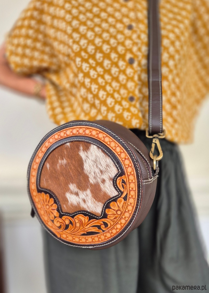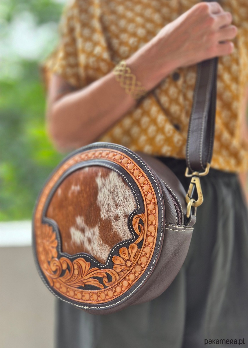 Ręcznie robiona skórzana torebka wykonana w Indiach, co nadaje jej unikalny charakter i autentyczny rys rękodzieła. Kształt torebki jest okrągły, elegancko wyprofilowany, idealny do codziennego użytku i wieczornych stylizacji. Zdobienie w postaci skórzanego rzeźbienia nadaje torbie trójwymiarowy, artystyczny wygląd i podkreśla charakter torebki. Wysoka jakość materiału zapewnia trwałość i długowieczność, a ręczne wykonanie dodaje torbie wyjątkowej wartości. Kompaktowe wnętrze z praktyczną przegródką mieści niezbędne drobiazgi, zachowując poręczność noszenia. Zgodna z różnymi stylami — od casual po bardziej eleganckie outfity — dzięki subtelnej kolorystyce i klasycznej koncepcji rzeźbienia. Doskonały wybór dla miłośników rękodzieła, unikalnych dodatków i wysokiej jakości skórzanych produktów.