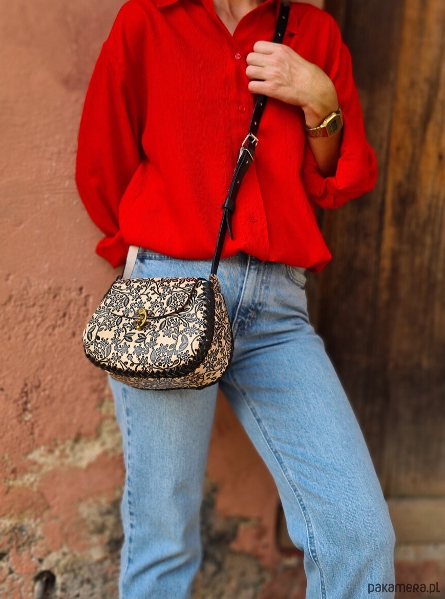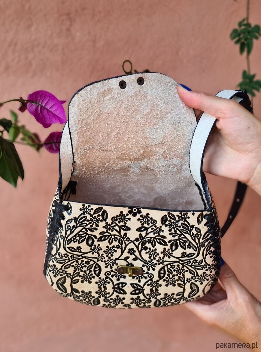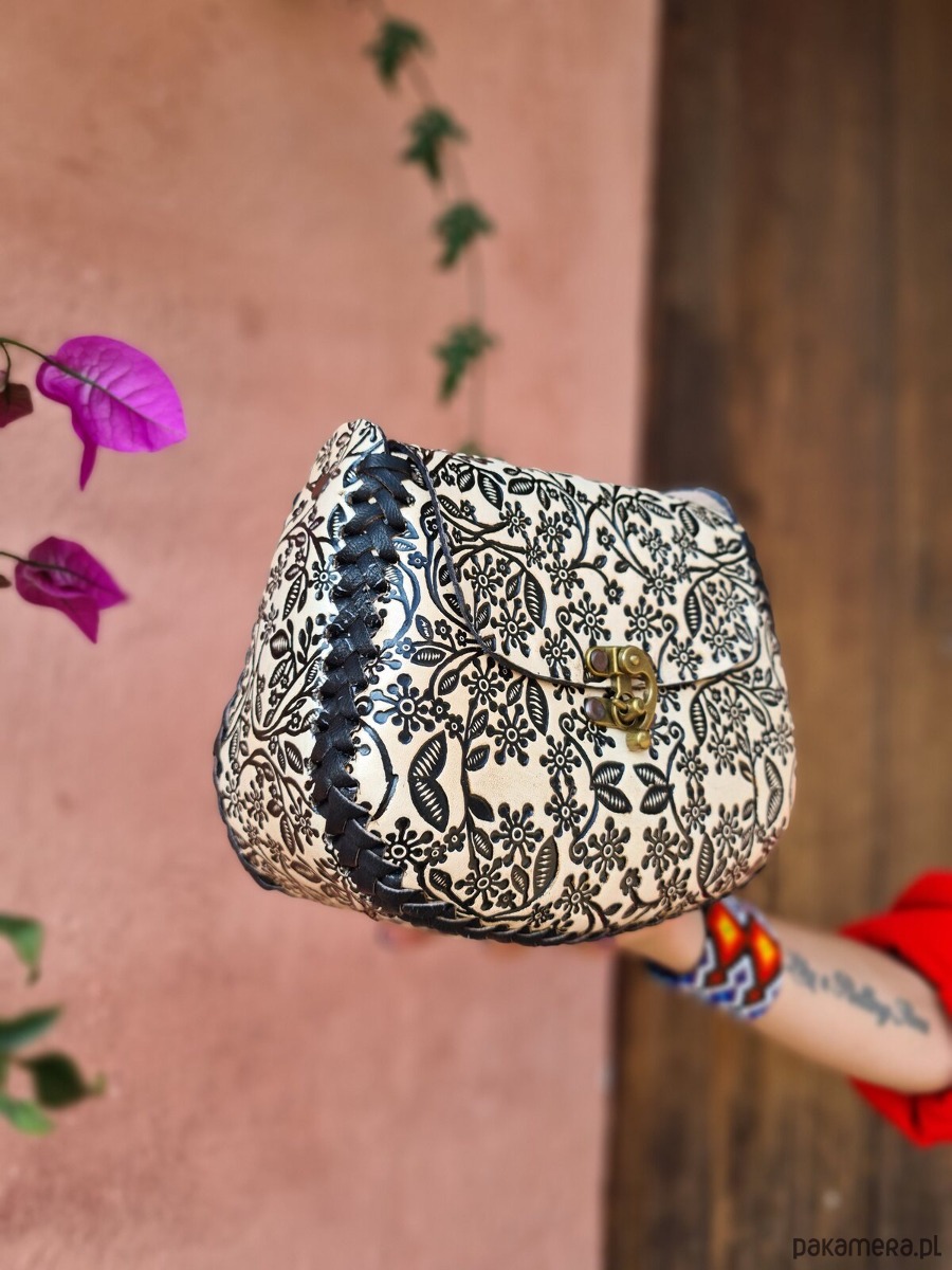 Skóra użyta to wykonania torebki jest ręcznie garbowana oraz ręcznie malowana, a wzory wykonane są za pomocą odpowiedniego stempla.