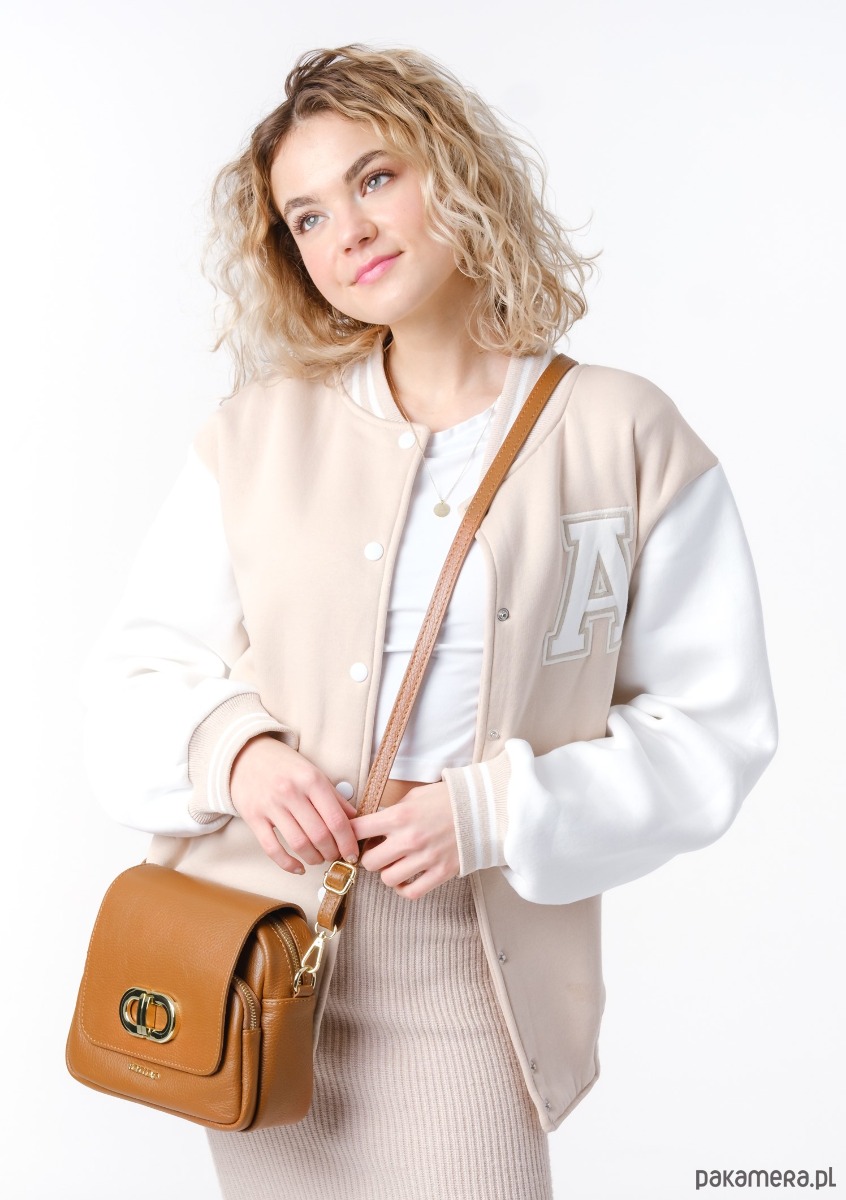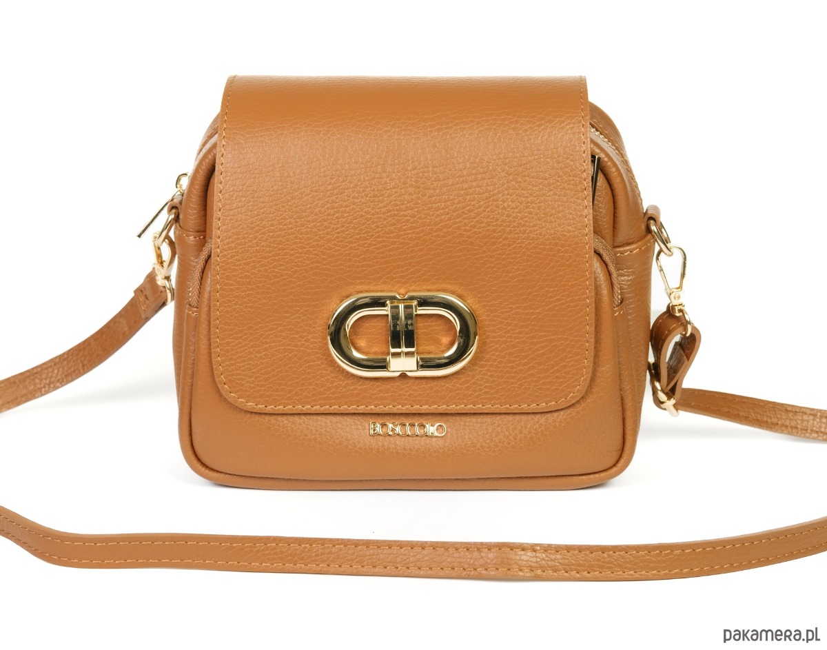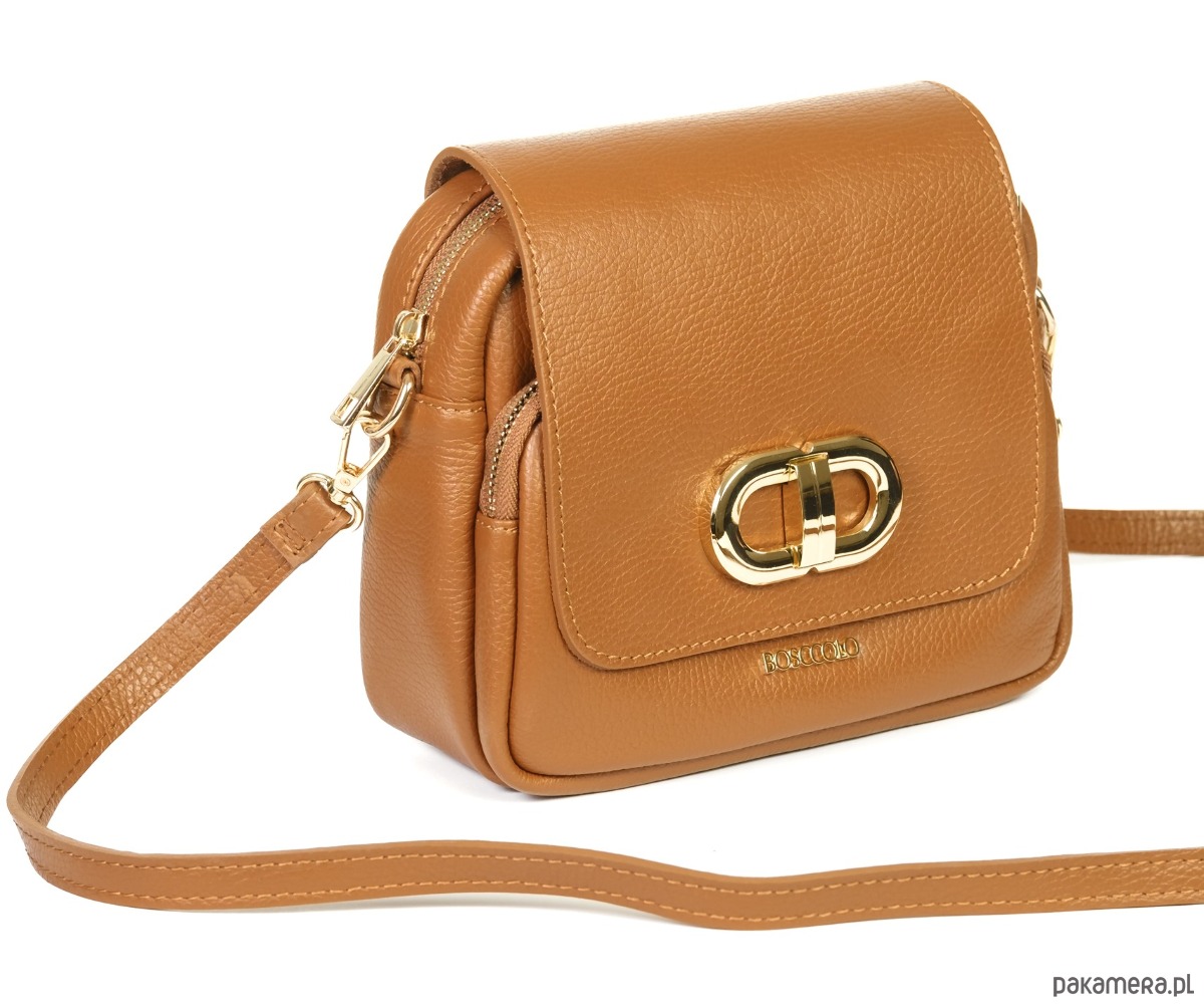 Torebka ze skóry naturalnej, na ramię, crossbody. Elegancki kształ, złota ozdoba.