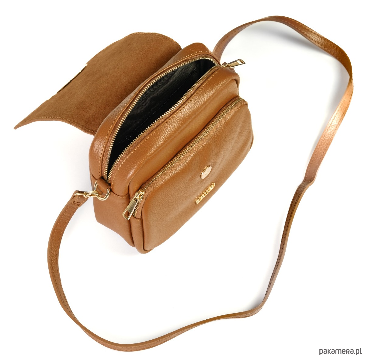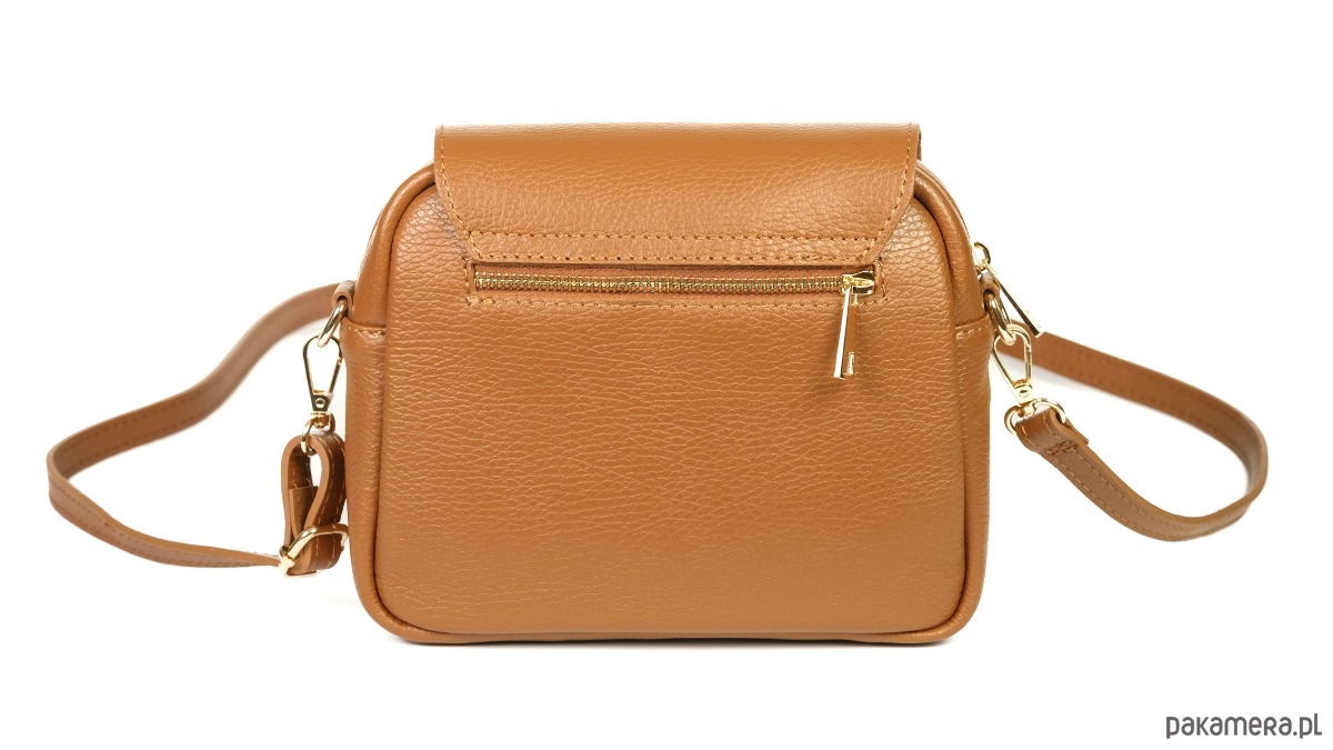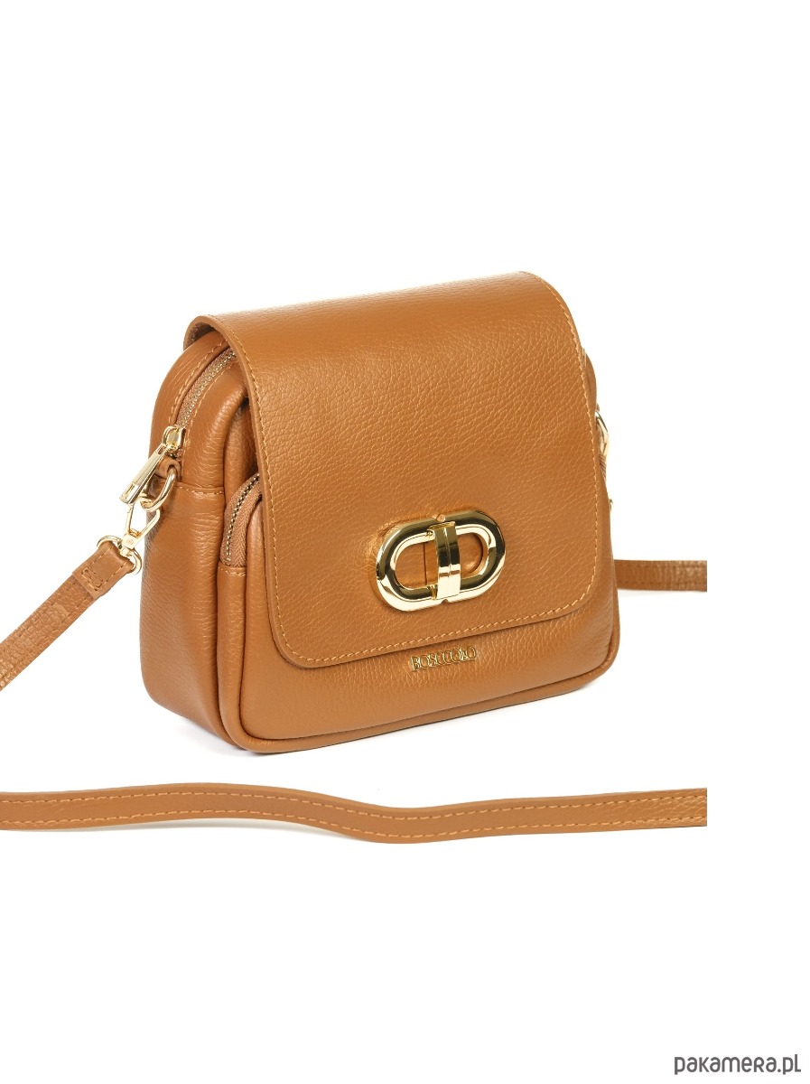 Torebka ze skóry naturalnej, na ramię, crossbody. Elegancki kształ, złota ozdoba.
