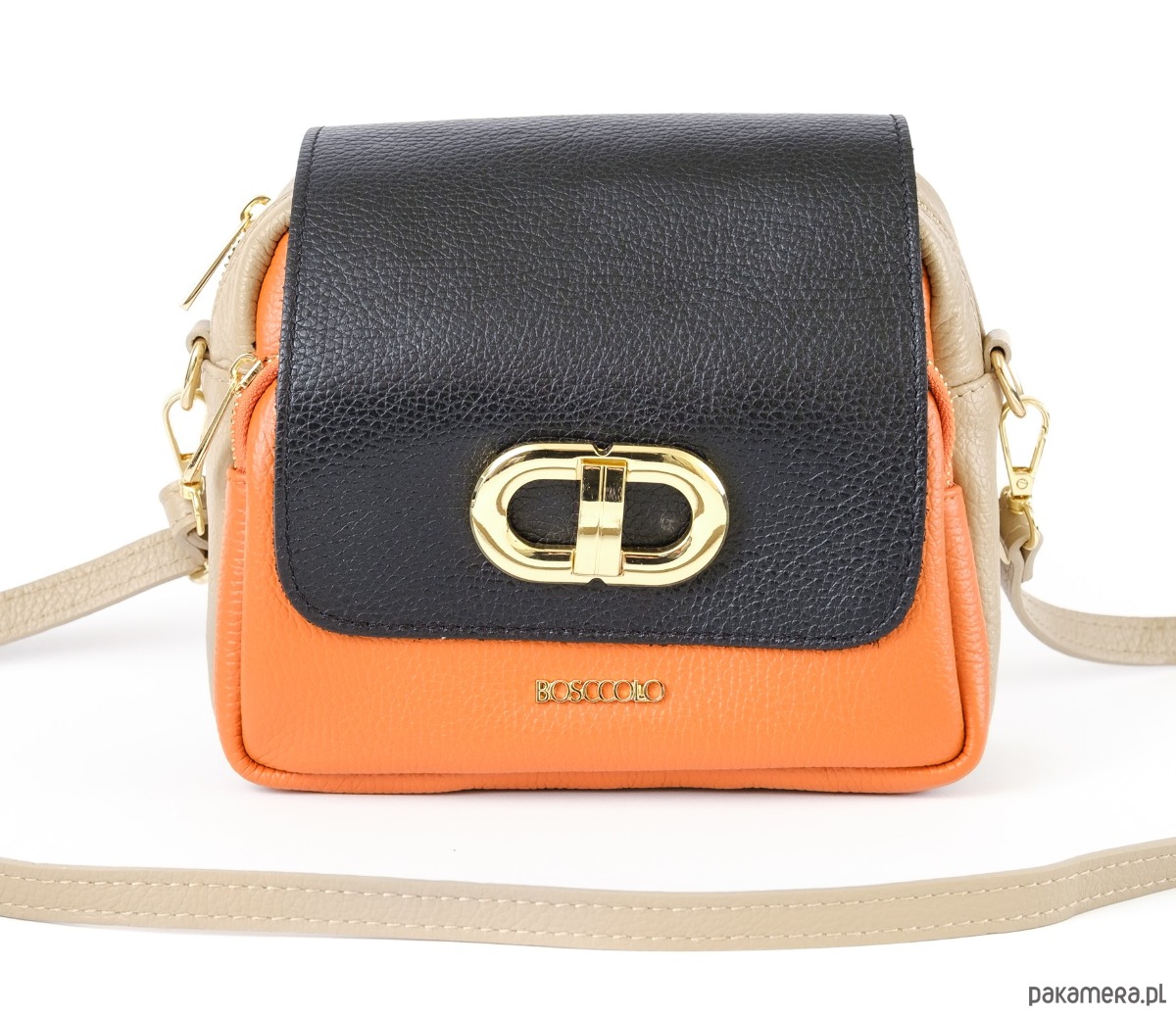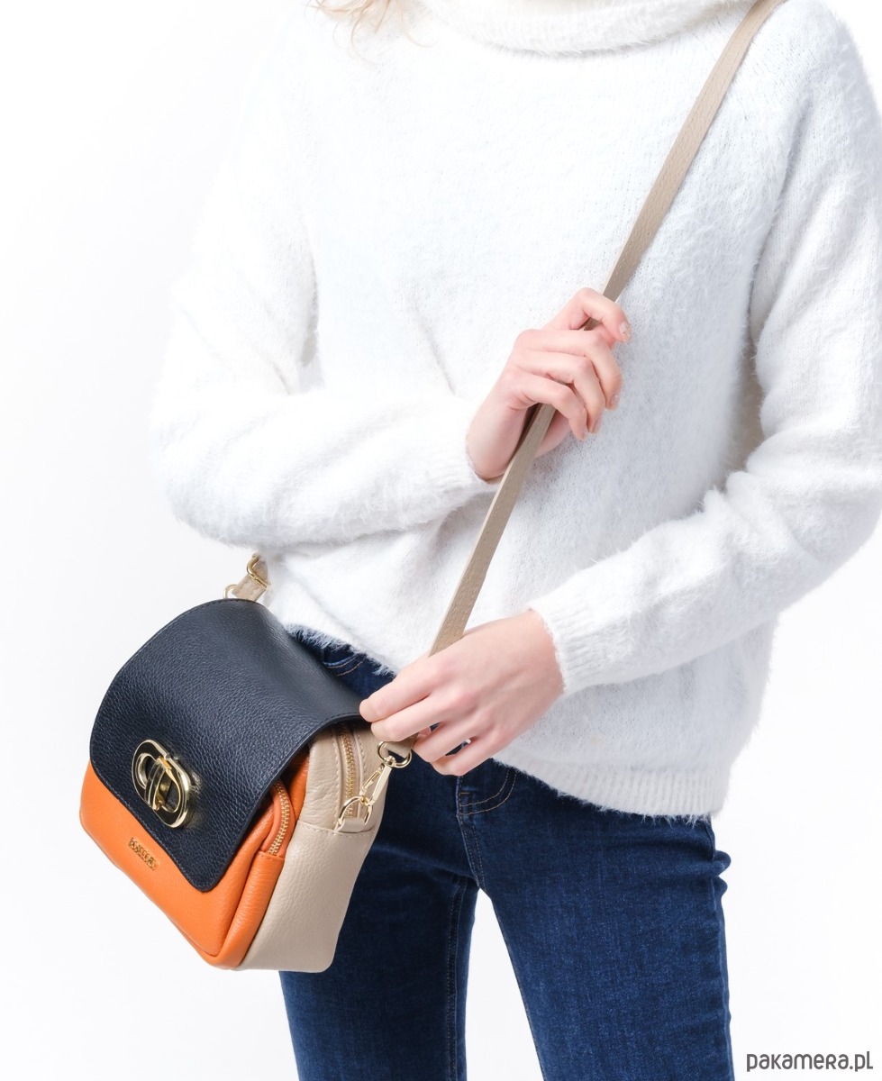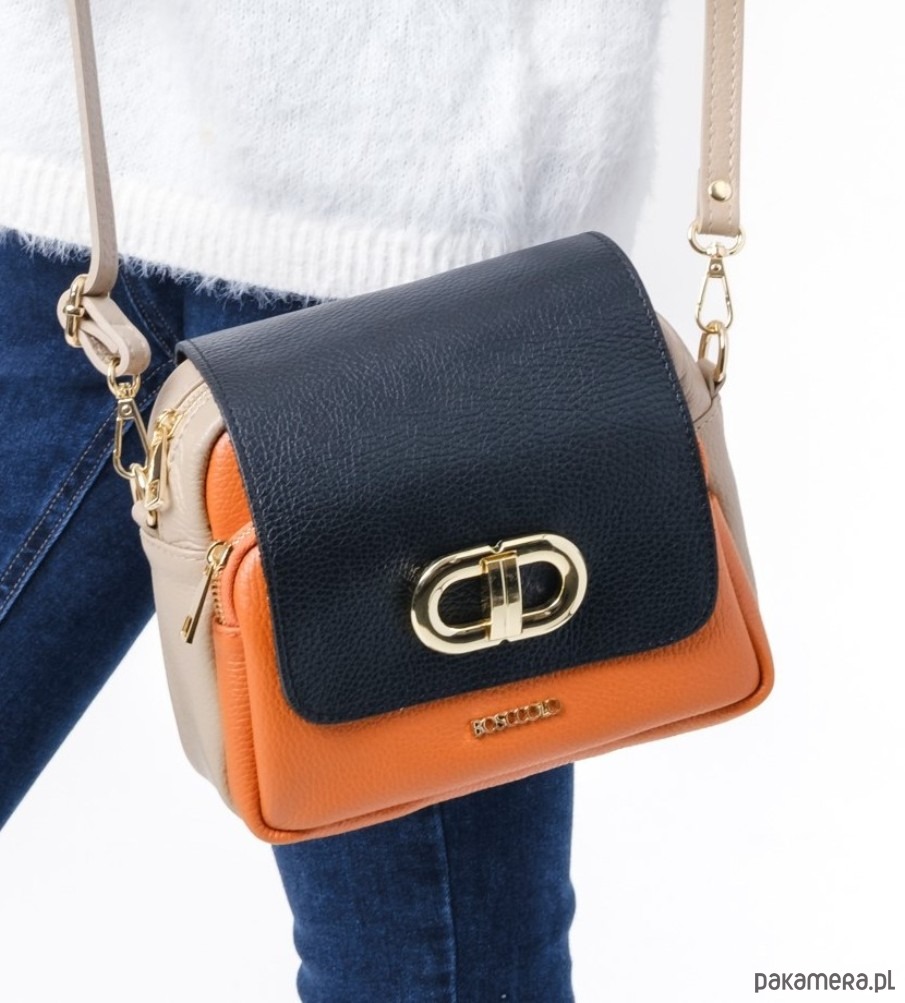 Torebka ze skóry naturalnej, na ramię, crossbody. Elegancki kształ, złota ozdoba.