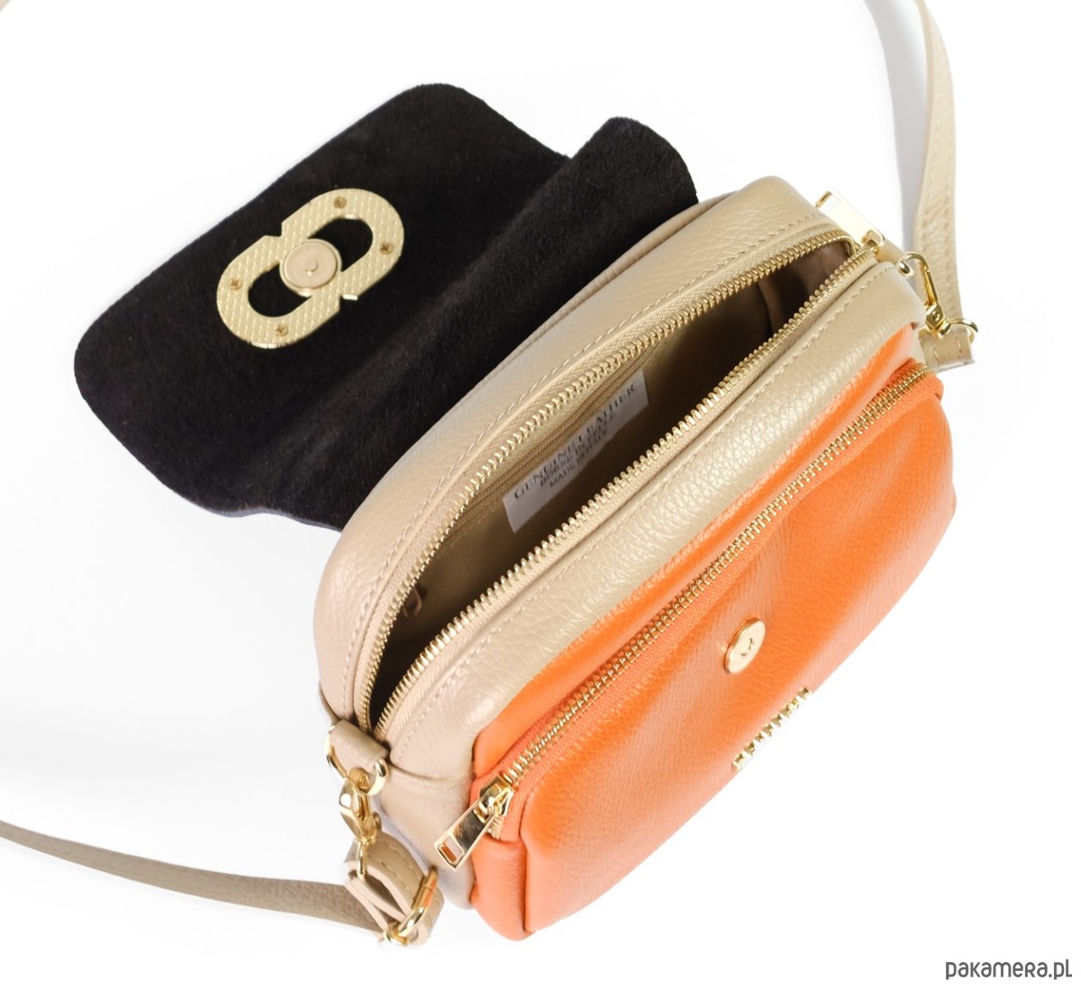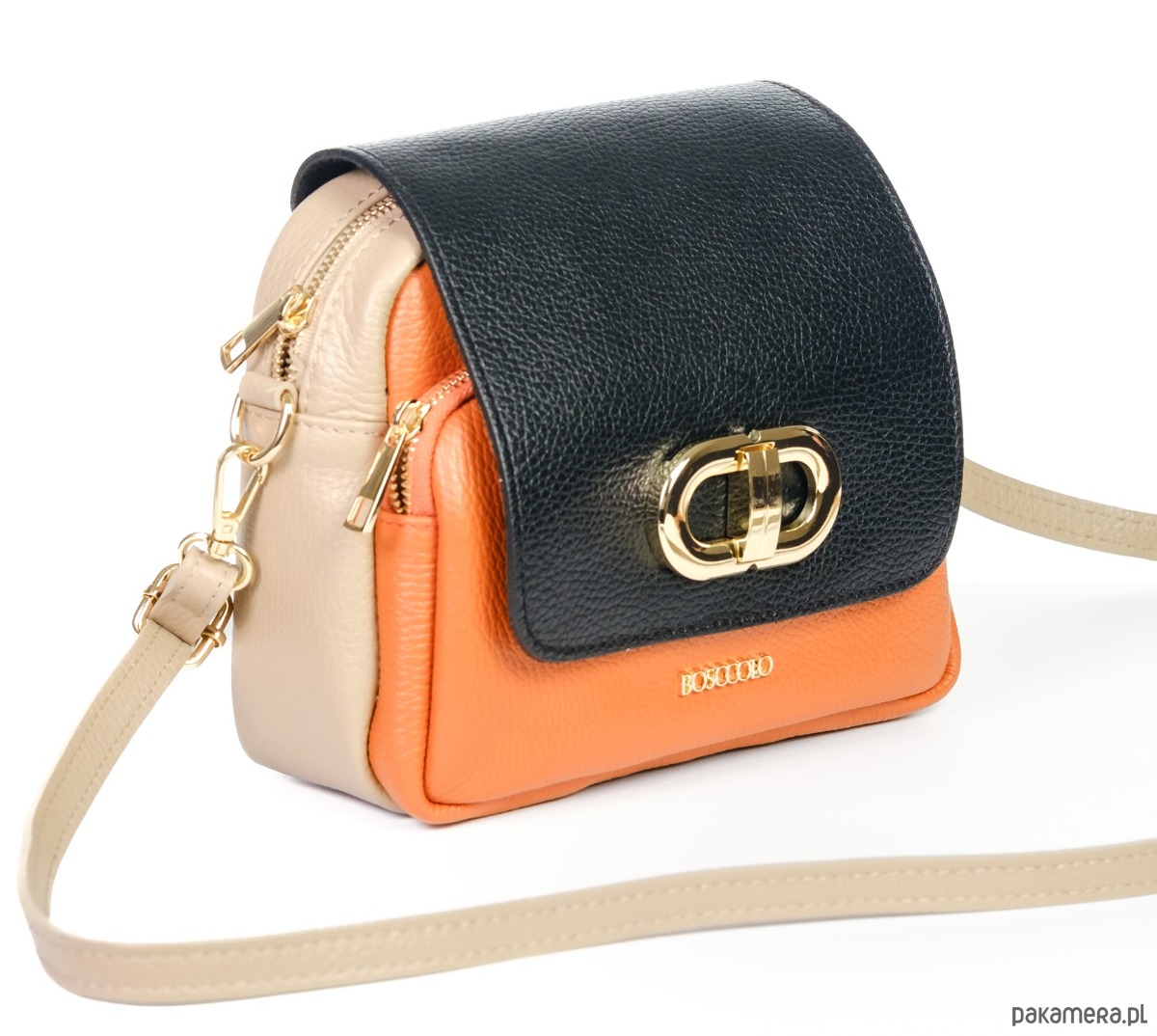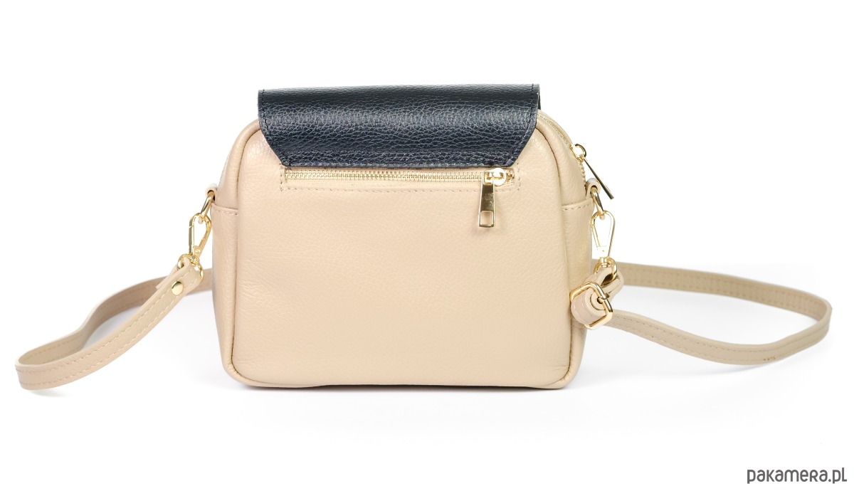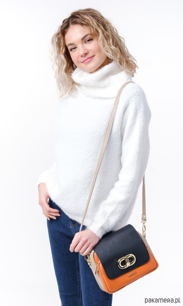 Torebka ze skóry naturalnej, na ramię, crossbody. Elegancki kształ, złota ozdoba.