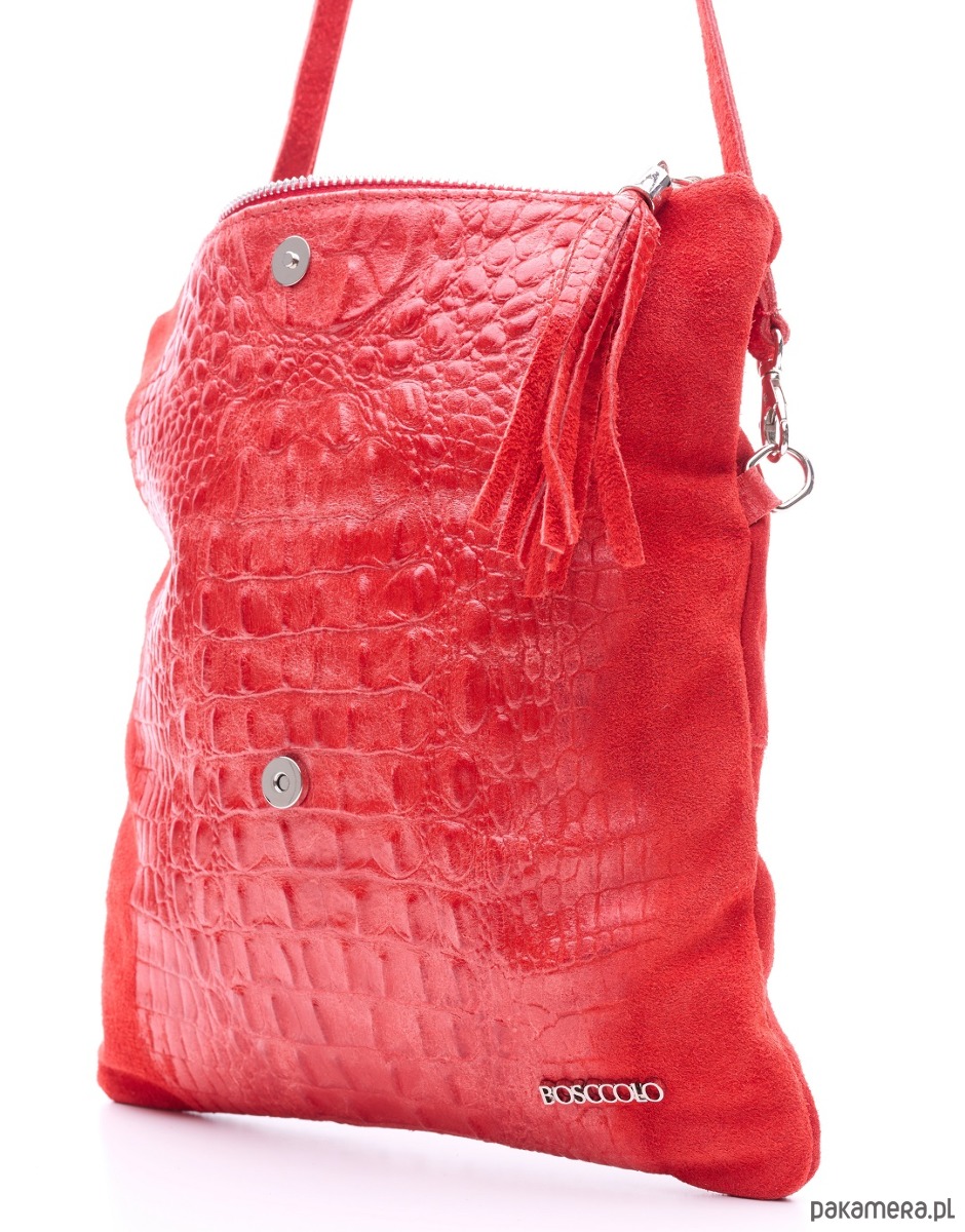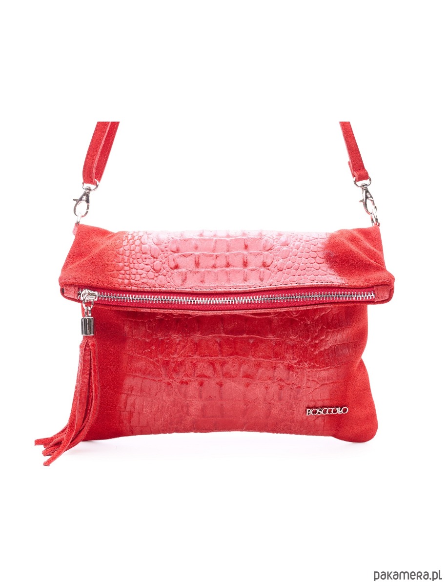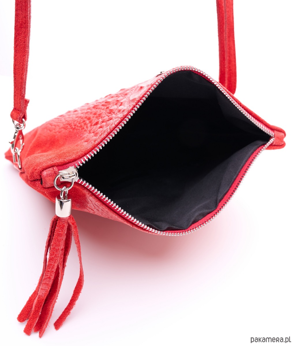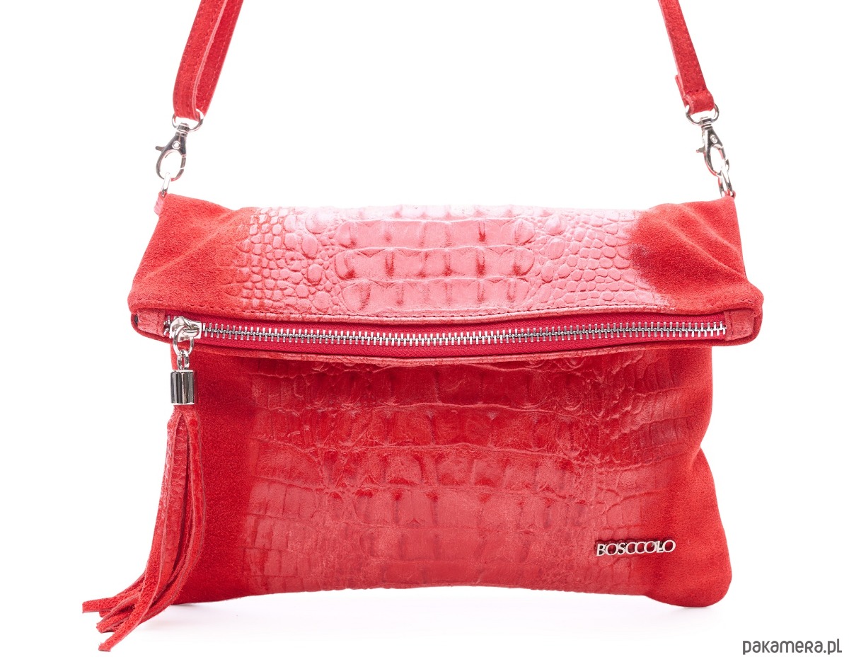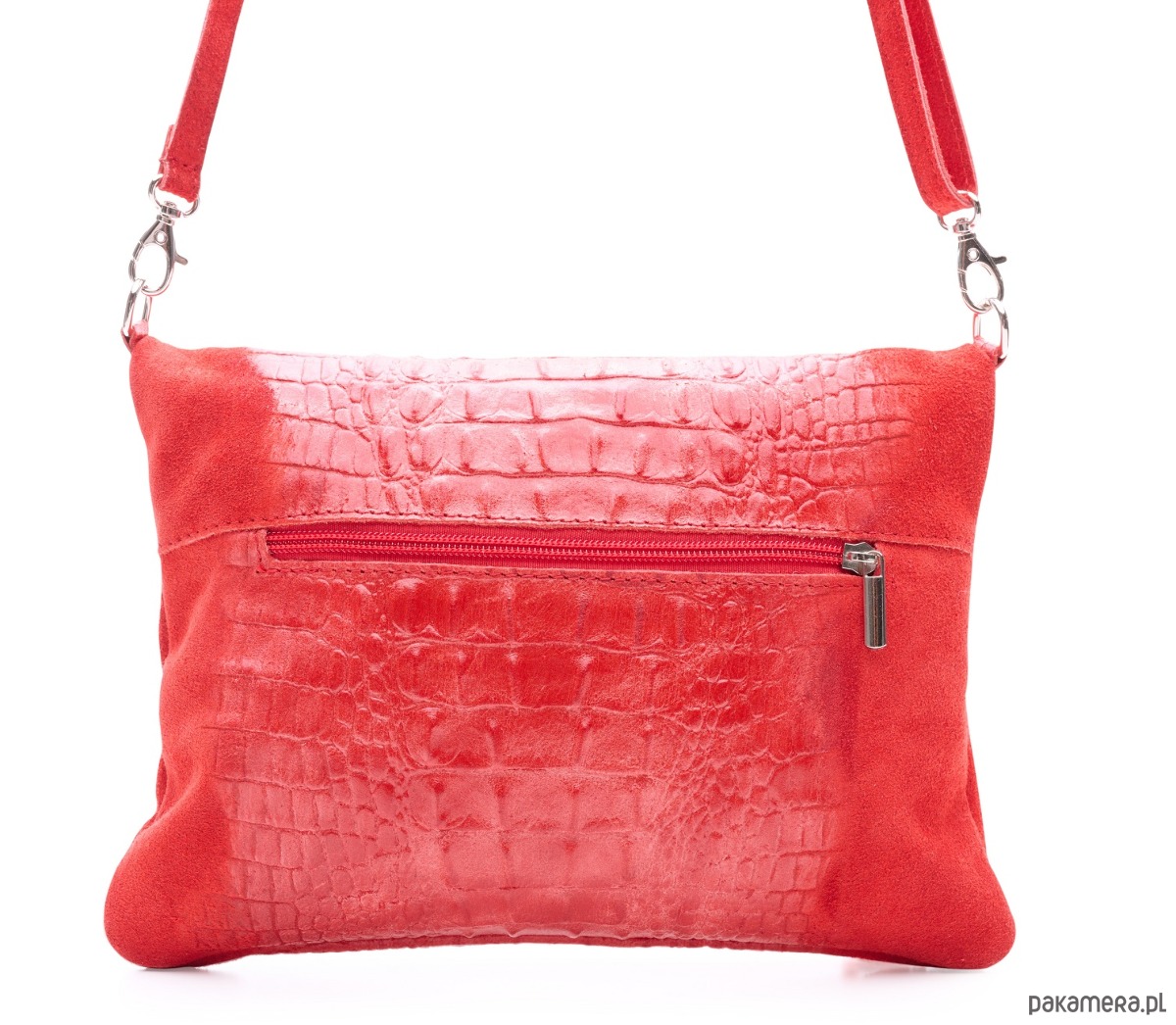 Skórzana torebka, kopertówka składana, którą można nosić w ręku lub na ramieniu, składa się z komory głównej i wewnętrznej kieszeni na suwak.