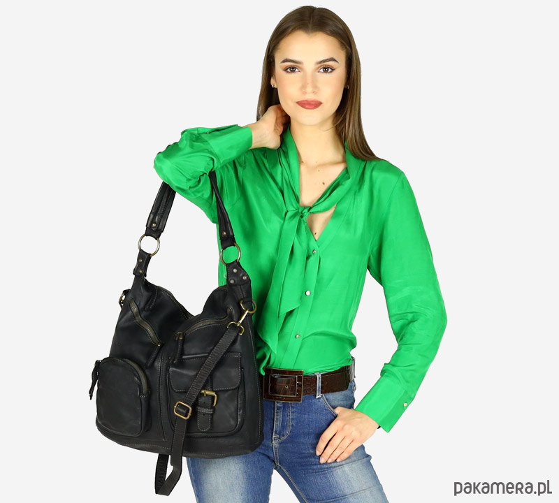 Torebka skórzany worek vintage w kolorze ponadczasowej czerni wykonana została z jakościowej skóry naturalnej old look (old school). Jest to solidna skóra bydlęca o gładkiej powierzchni. Charakterystyczna dla tego typu skóry jest duża wytrzymałość na obciążenie. Torebka jest ręcznie szyta, a następnie W CAŁOŚCI farbowana. Dzięki procesom postarzania, uszlachetniania i zmiękczania skóry jest miękka i aksamitna w dotyku. Barwniki użyte do farbowania skóry to wyłącznie barwniki roślinne, nieuczulające i całkiem bezpieczne.