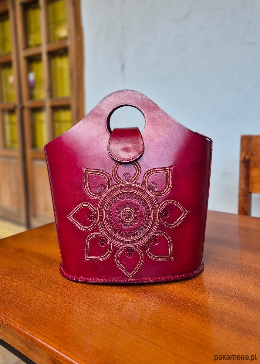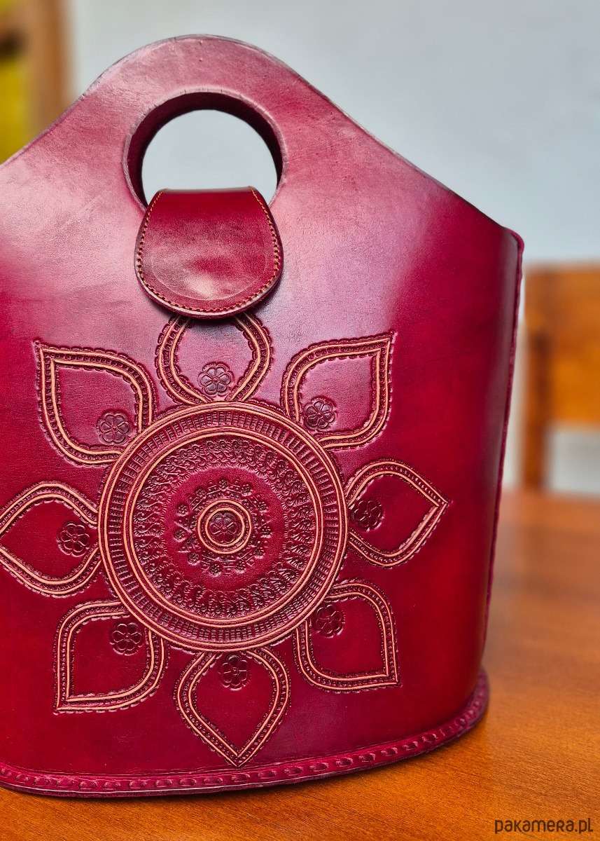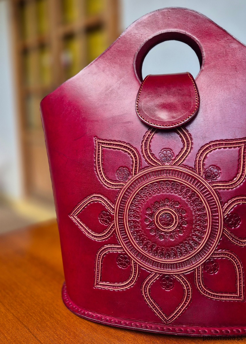Unikalny, Wybijany Wzór: Front torebki zdobi misterny, ręcznie wybijany (tłoczony) motyw mandali. To precyzyjna praca rzemieślnika, która nadaje torebce etniczny i artystyczny charakter.