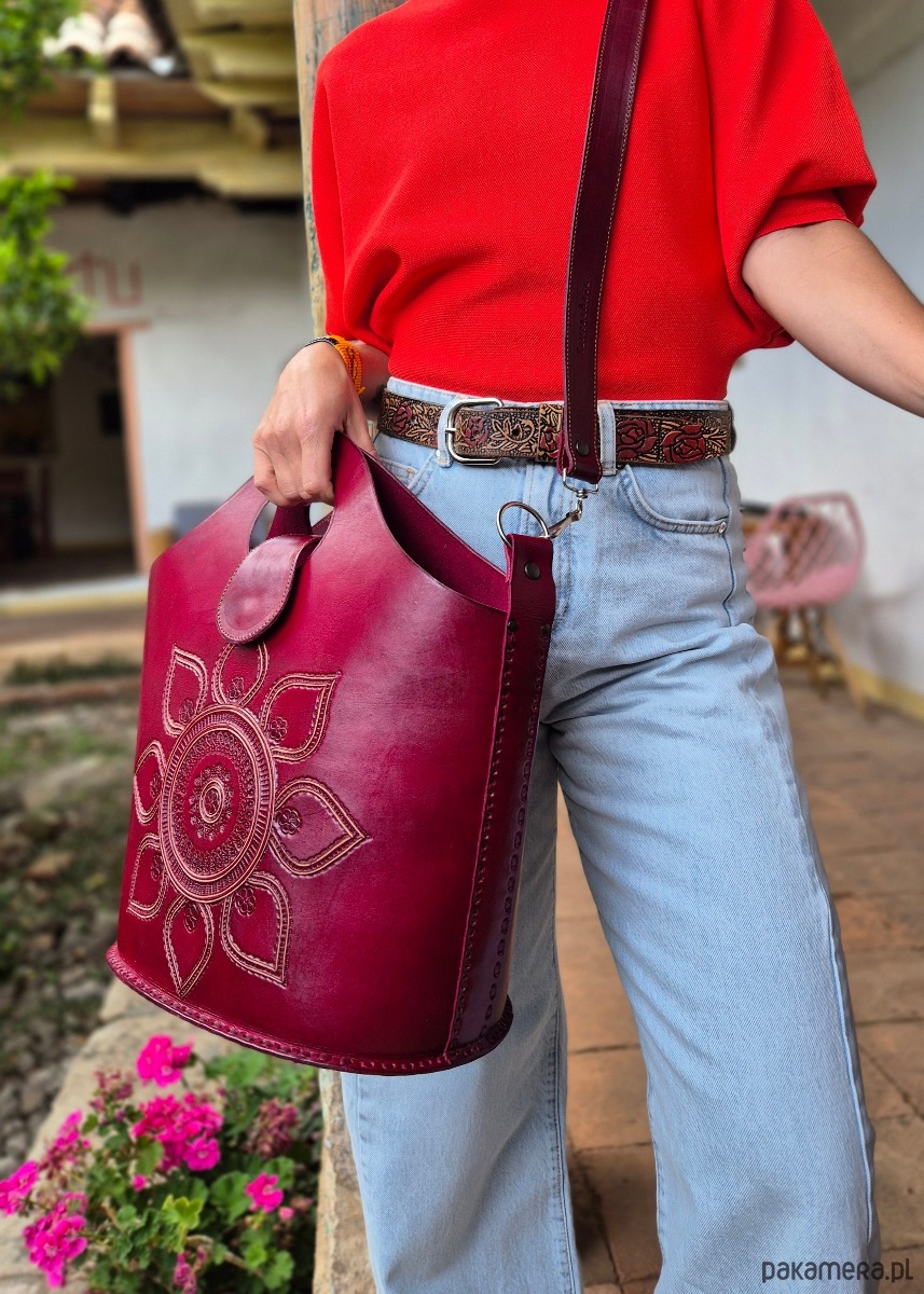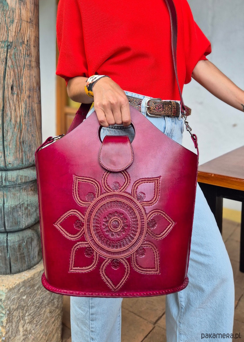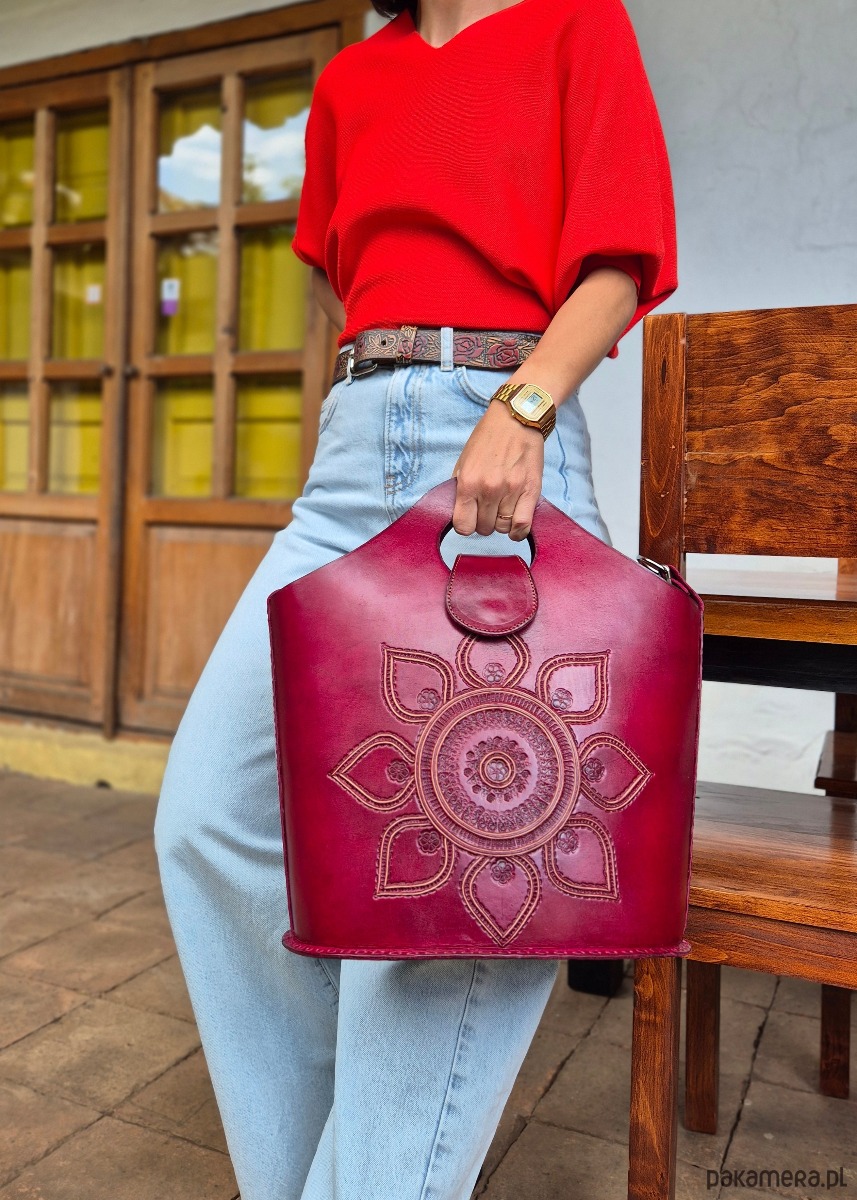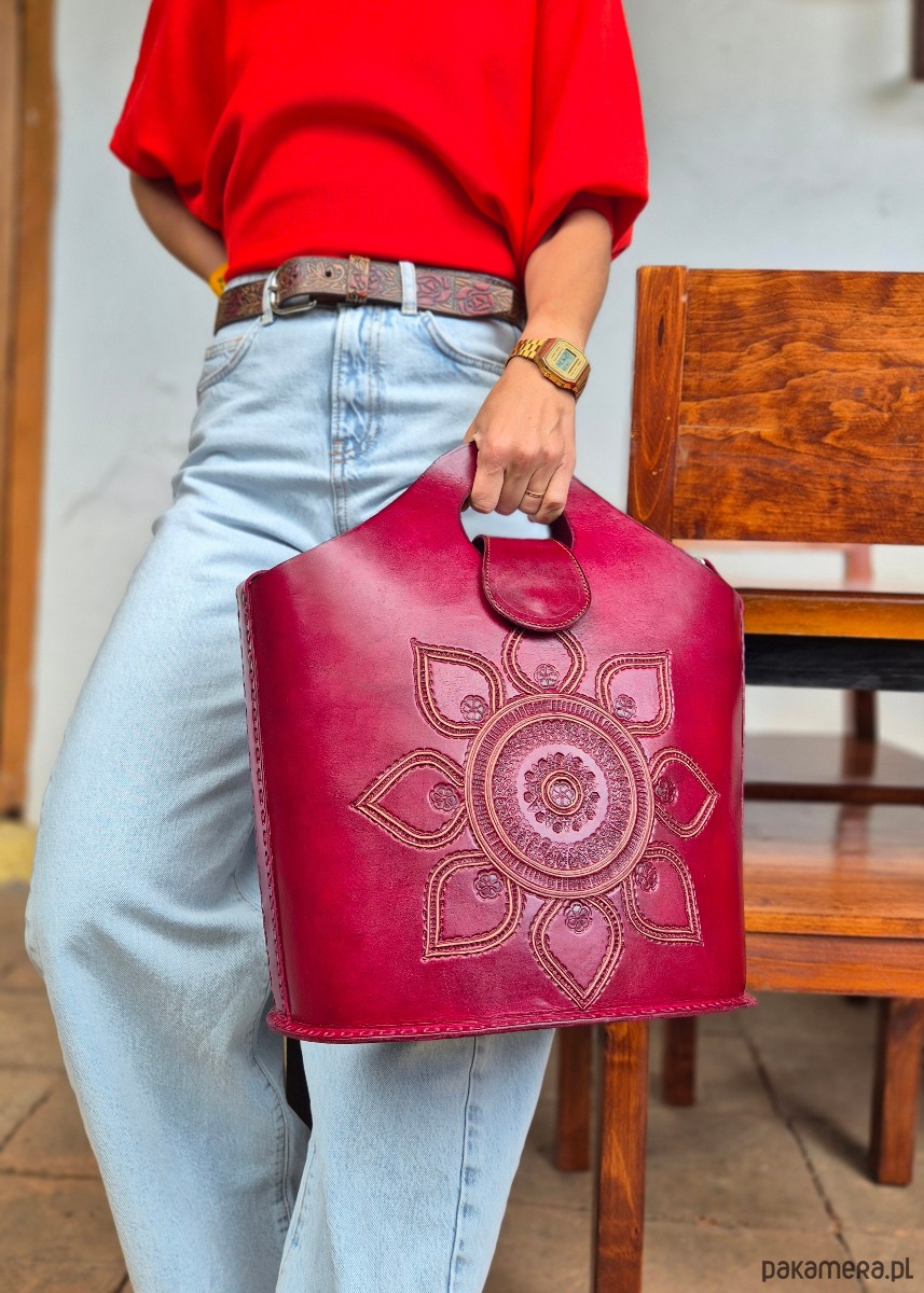 Unikalny, Wybijany Wzór: Front torebki zdobi misterny, ręcznie wybijany (tłoczony) motyw mandali. To precyzyjna praca rzemieślnika, która nadaje torebce etniczny i artystyczny charakter.