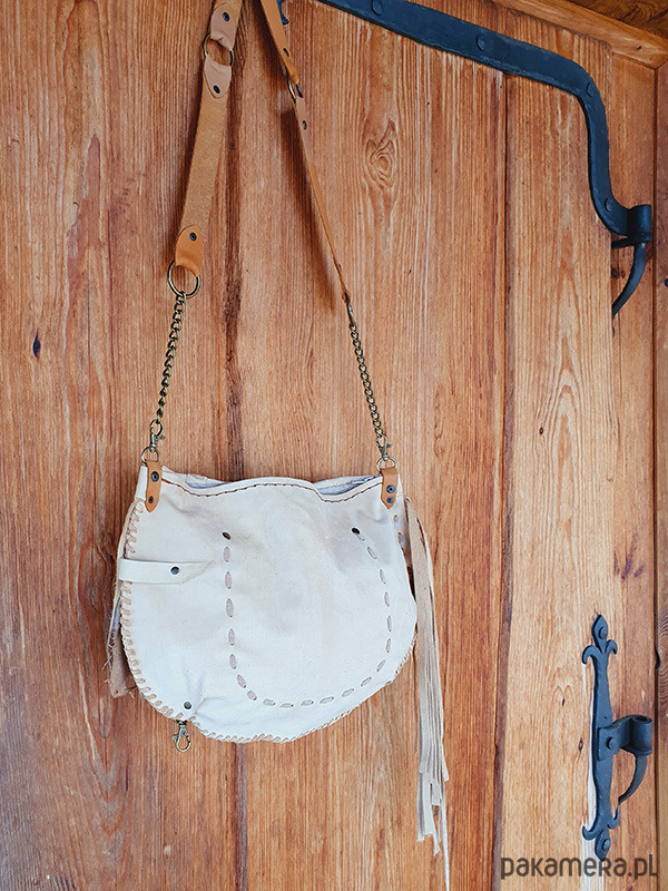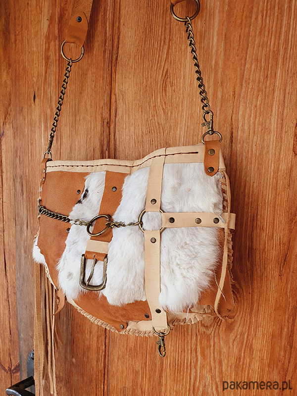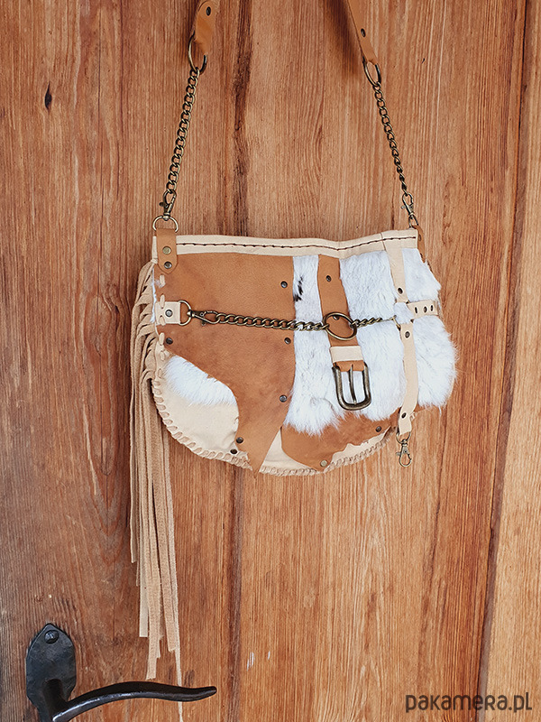 Unikatowa torebka, ręcznie wykonana ze skóry naturalnej wysokiej jakości: bydlęcej i króliczej. Skóra nie jest sztywna więc torebka będzie dopasowywać się do Ciebie.
