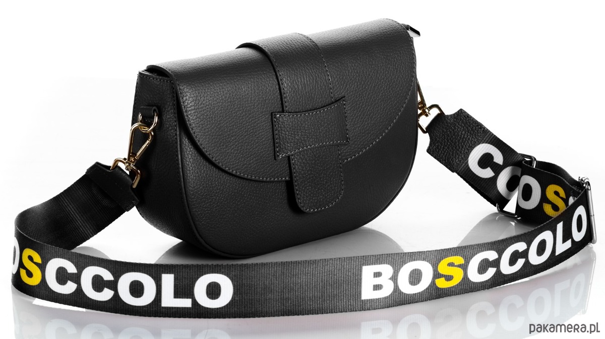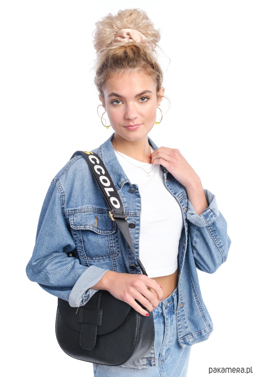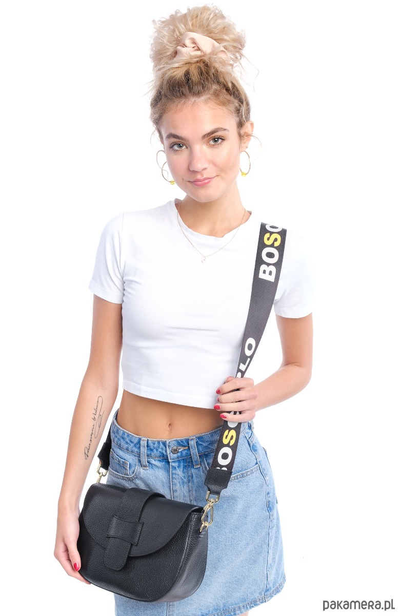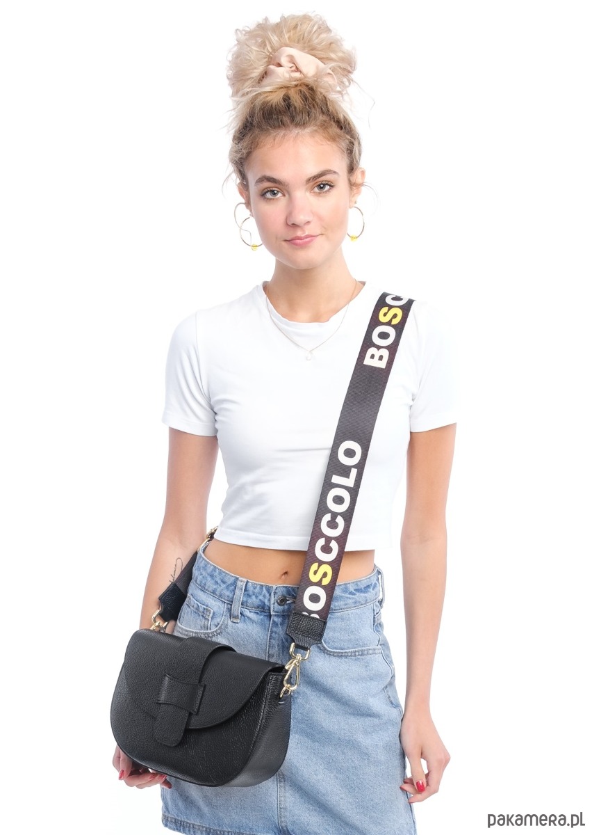 dodatkowo dopinany szeroki na 5 cm pasek tekstylny z logo, skórzane końcówki w kolorze torebki,regulowany, max 135 cm