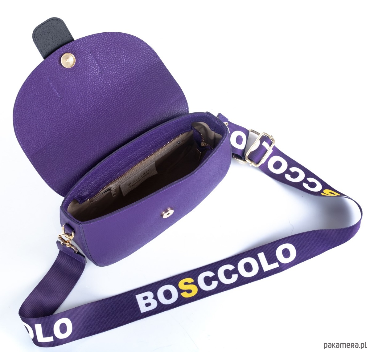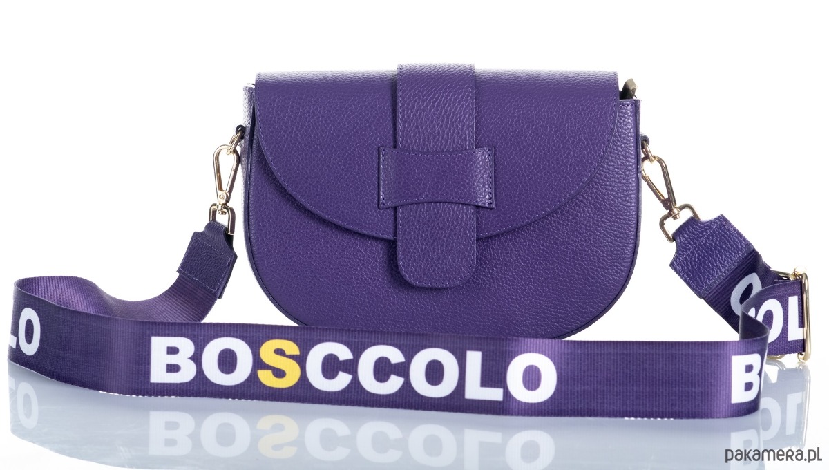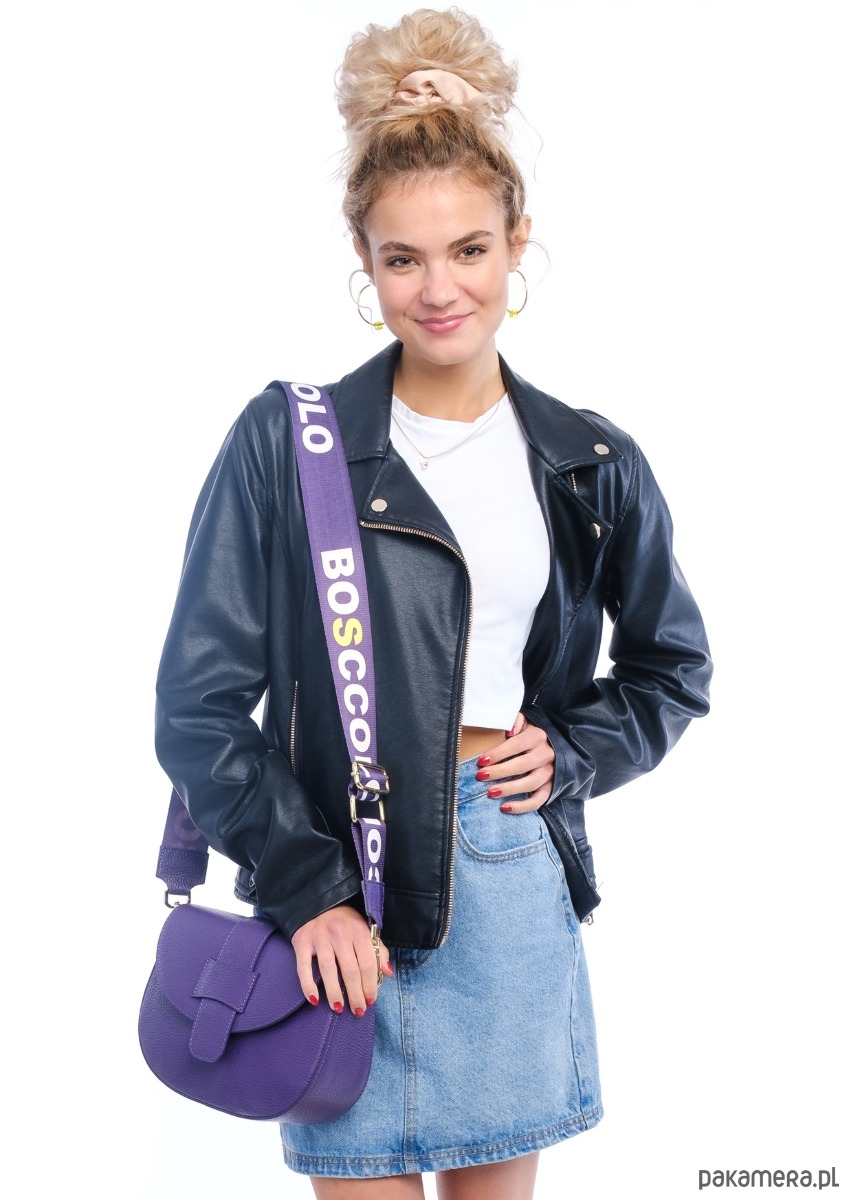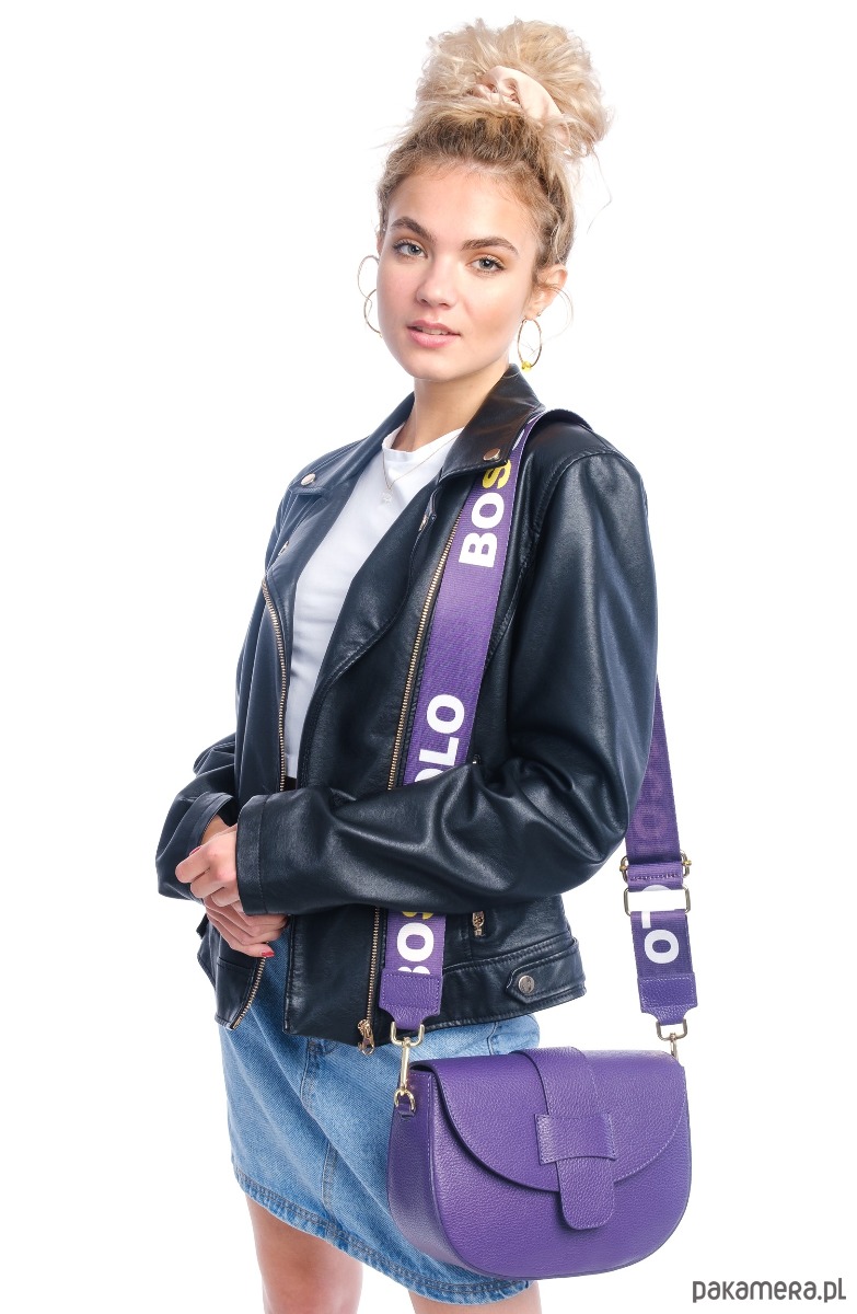 dodatkowo dopinany szeroki na 5 cm pasek tekstylny z logo, skórzane końcówki w kolorze torebki,regulowany, max 135 cm