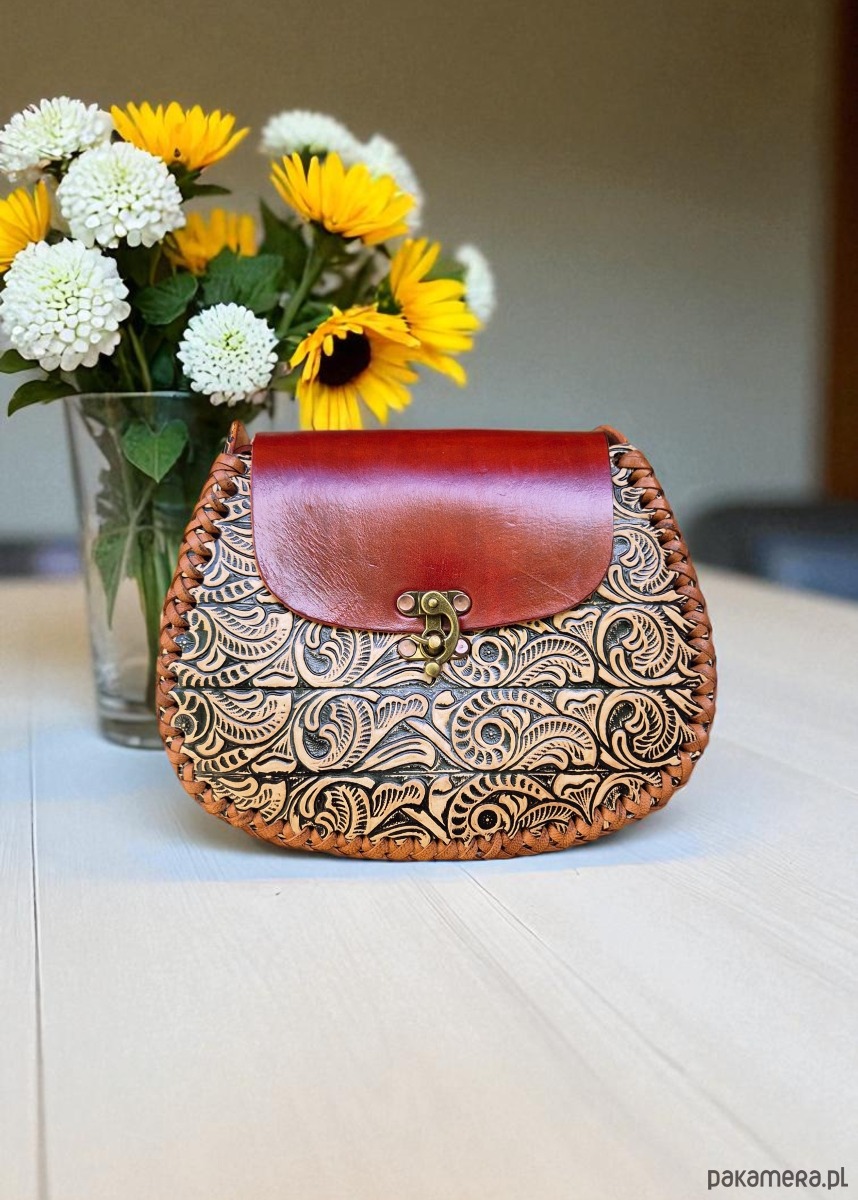 Skórzana torebka, ręcznie wykonana w Meksyku z grubej skóry naturalnej. Jej unikalny design zdobią wzory z motywem kwiatowym, które nadają jej niepowtarzalny styl i charakter. Każdy detal torebki został starannie wykonany przez doświadczonych rzemieślników, co sprawia, że jest ona nie tylko pięknym, ale także trwałym dodatkiem do garderoby. Wykorzystanie skóry naturalnej gwarantuje, że torebka będzie służyć przez wiele lat, zachowując swój wyjątkowy wygląd. Jej ciekawy design sprawia, że doskonale sprawdzi się jako dodatek zarówno do codziennych stylizacji, jak i na wyjątkowe okazje. Ta torebka to nie tylko praktyczny element garderoby, ale również wyraz artystycznego kunsztu meksykańskich rzemieślników, którzy tworząc ją, przelewają w nią swoją pasję i tradycje.