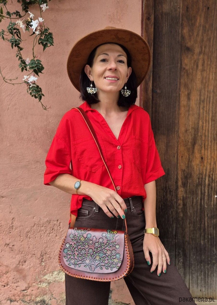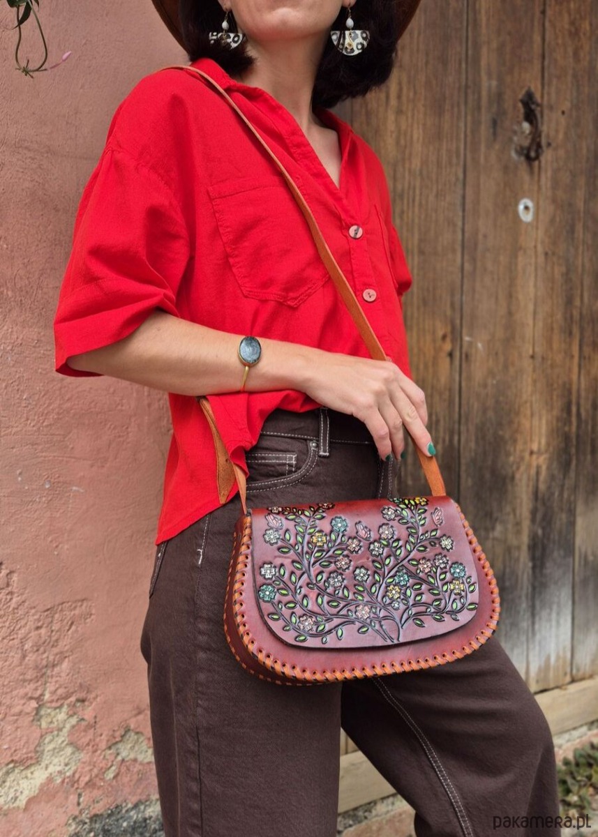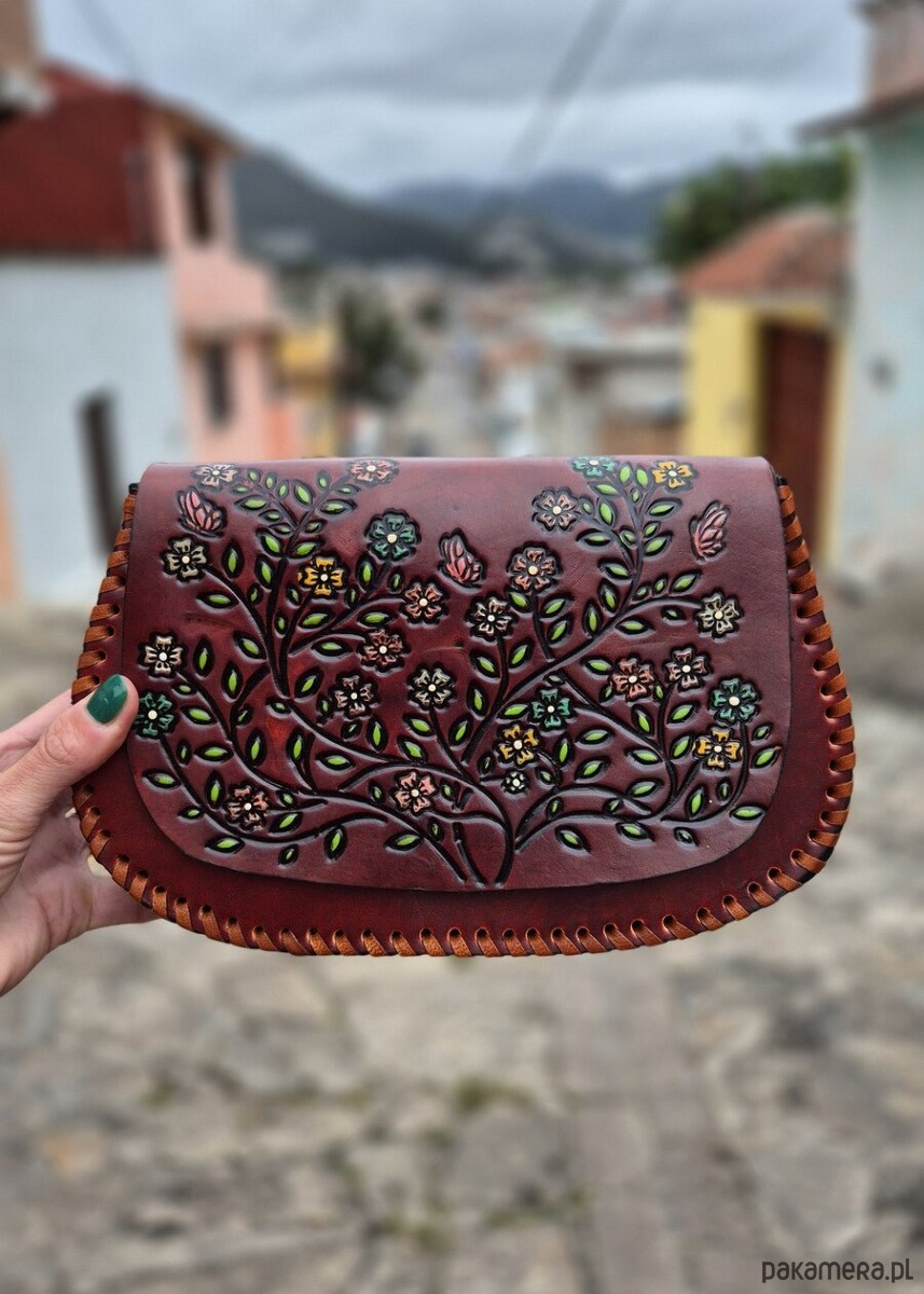 Skórzana torebka, ręcznie wykonana w Meksyku z grubej skóry naturalnej. Jej unikalny design zdobią wzory z motywem drobnych kwiatów, które nadają jej niepowtarzalny styl i charakter. Każdy detal torebki został starannie wykonany przez doświadczonych rzemieślników, co sprawia, że jest ona nie tylko pięknym, ale także trwałym dodatkiem do garderoby. Wykorzystanie skóry naturalnej gwarantuje, że torebka będzie służyć przez wiele lat, zachowując swój wyjątkowy wygląd. Jej ciekawy design sprawia, że doskonale sprawdzi się jako dodatek zarówno do codziennych stylizacji, jak i na wyjątkowe okazje. Ta torebka to nie tylko praktyczny element garderoby, ale również wyraz artystycznego kunsztu meksykańskich rzemieślników, którzy tworząc ją, przelewają w nią swoją pasję i tradycje.