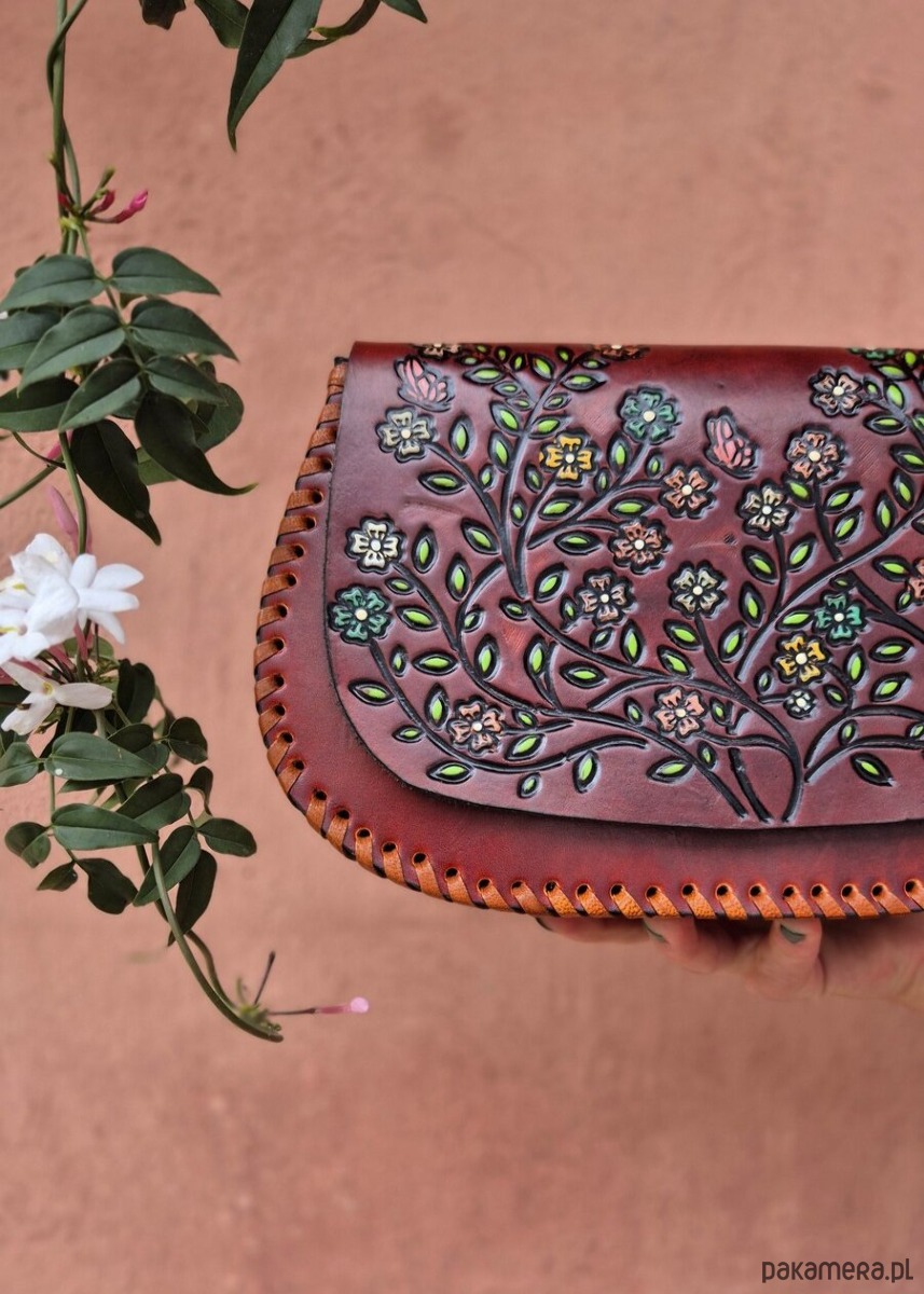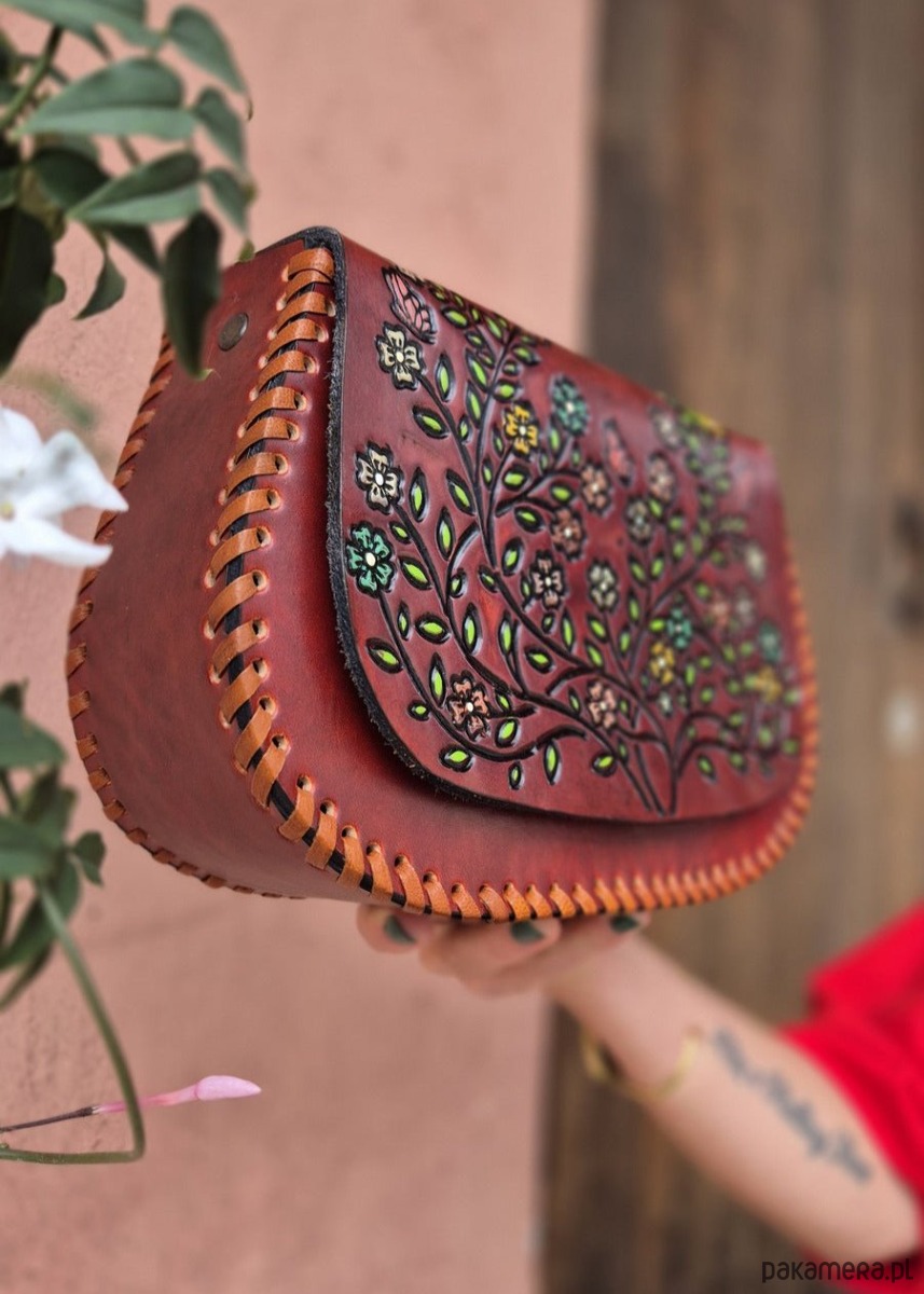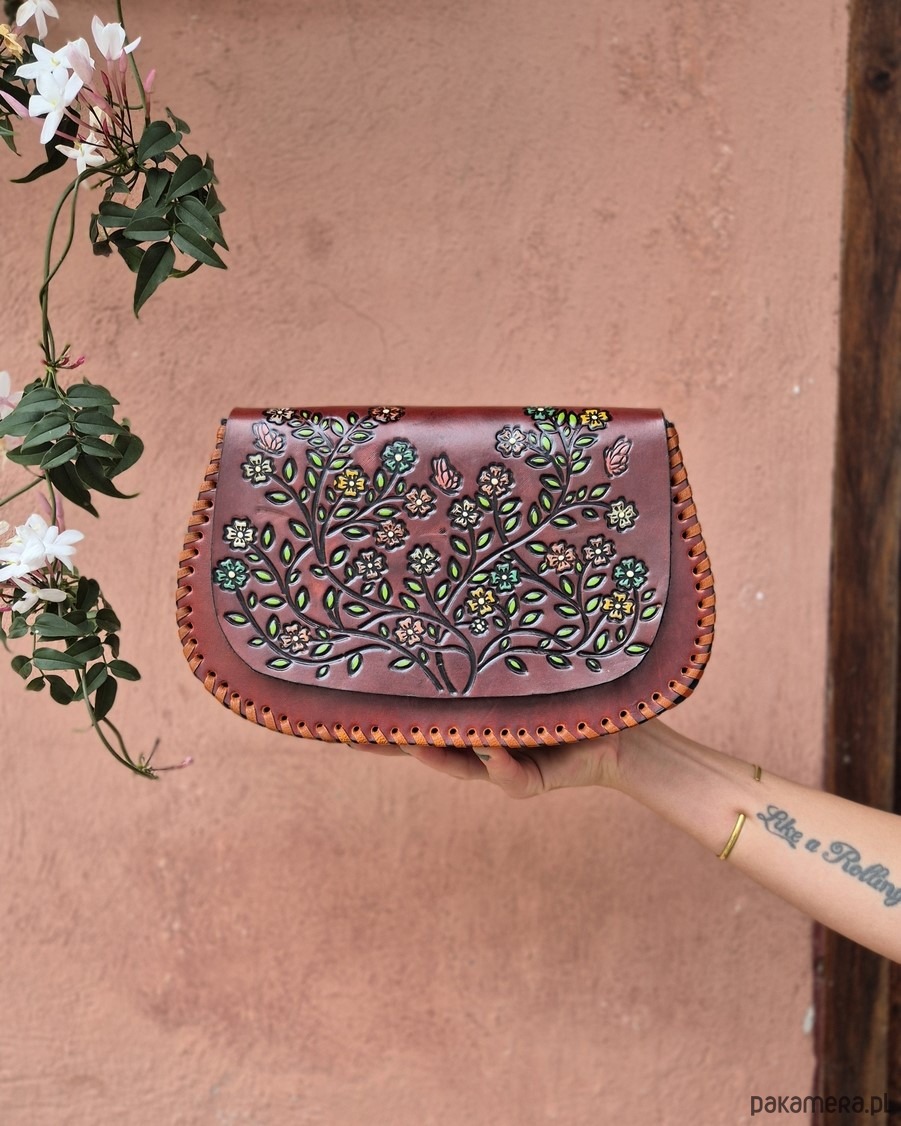 Skóra użyta to wykonania torebki jest ręcznie garbowana oraz ręcznie malowana, a wzory wykonane są za pomocą odpowiedniego stempla.