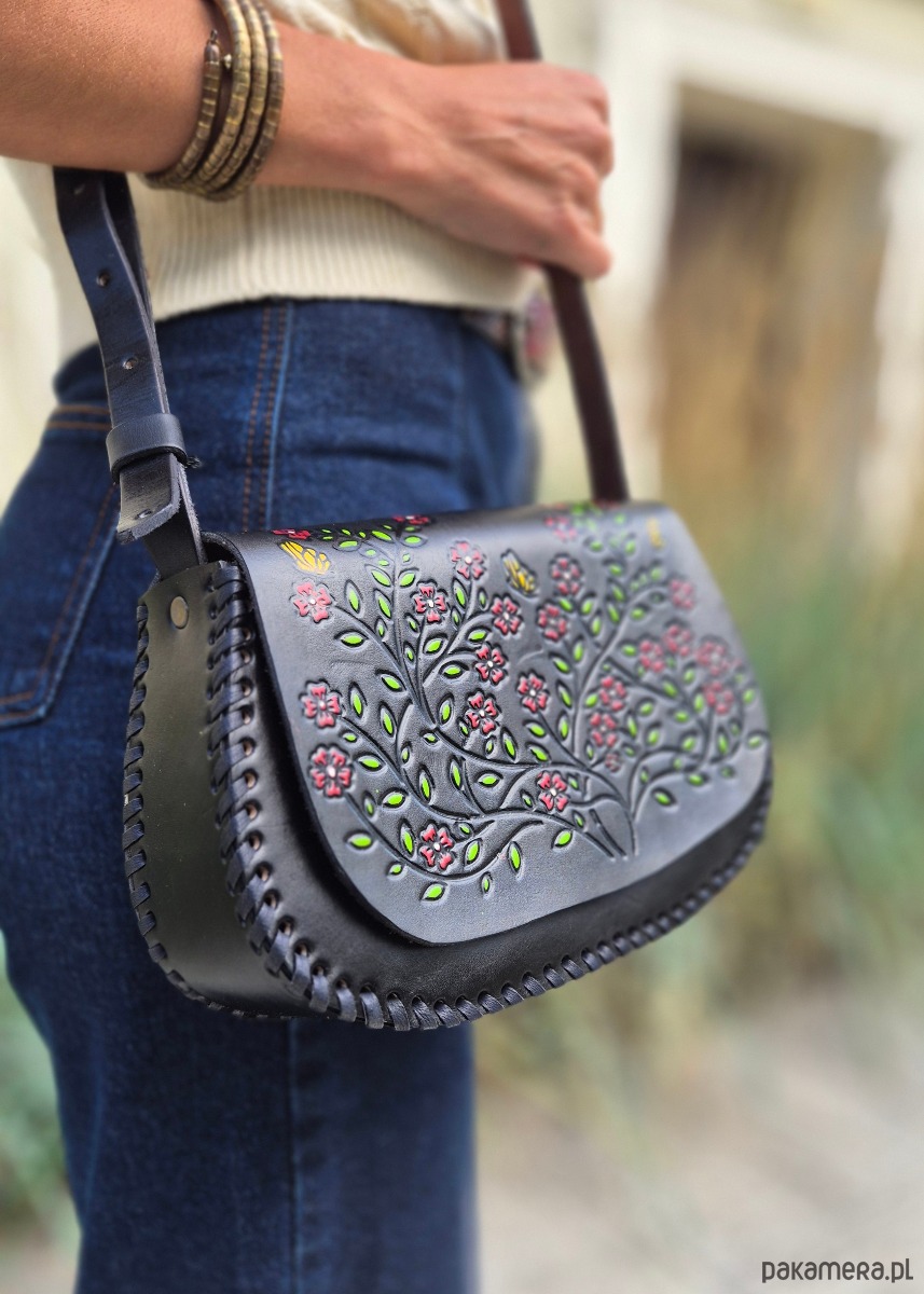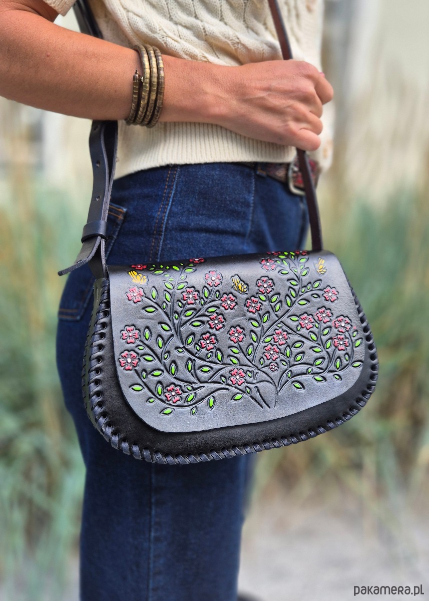 Skóra użyta to wykonania torebki jest ręcznie garbowana oraz ręcznie malowana, a wzory wykonane są za pomocą odpowiedniego stempla.