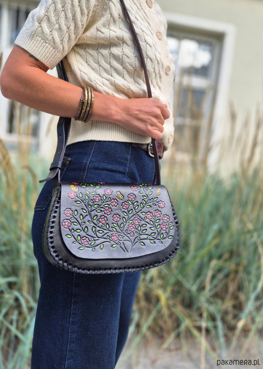 Skórzana torebka, ręcznie wykonana w Meksyku z grubej skóry naturalnej. Jej unikalny design zdobią wzory z motywem drobnych kwiatów, które nadają jej niepowtarzalny styl i charakter. Każdy detal torebki został starannie wykonany przez doświadczonych rzemieślników, co sprawia, że jest ona nie tylko pięknym, ale także trwałym dodatkiem do garderoby. Wykorzystanie skóry naturalnej gwarantuje, że torebka będzie służyć przez wiele lat, zachowując swój wyjątkowy wygląd. Jej ciekawy design sprawia, że doskonale sprawdzi się jako dodatek zarówno do codziennych stylizacji, jak i na wyjątkowe okazje. Ta torebka to nie tylko praktyczny element garderoby, ale również wyraz artystycznego kunsztu meksykańskich rzemieślników, którzy tworząc ją, przelewają w nią swoją pasję i tradycje.