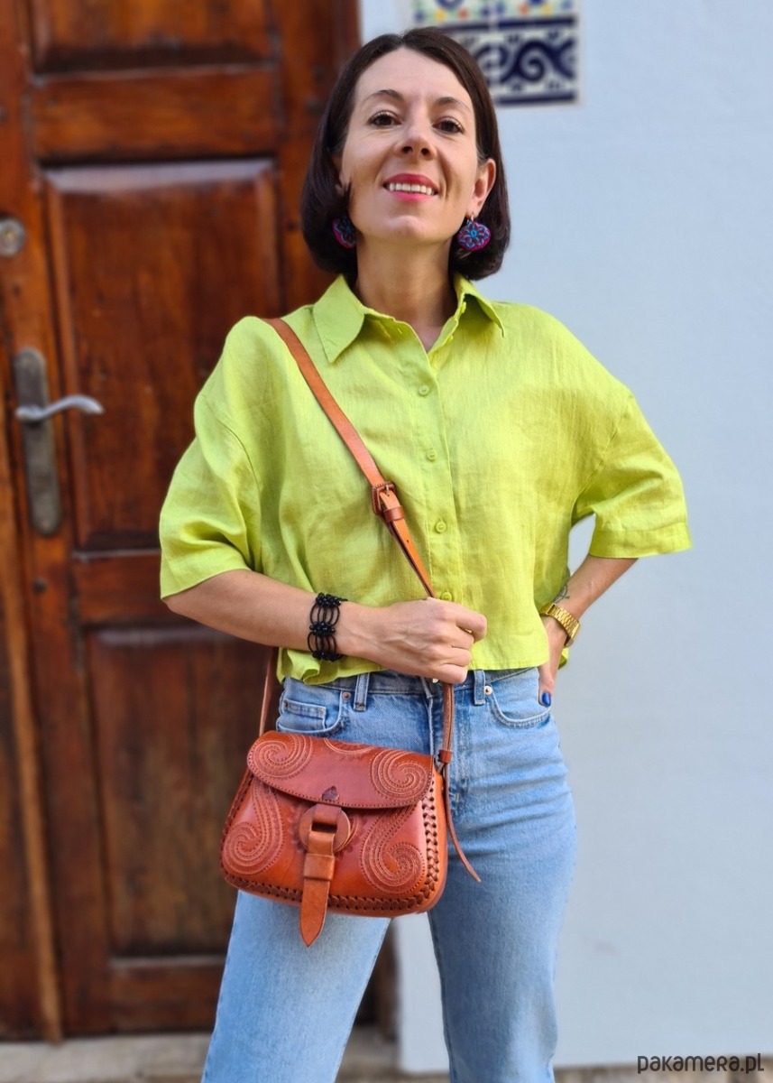 Piękna, ręcznie robiona skórzana torebka. Kształt trapezu oraz bardzo ciekawe wzory sprawiają, że jest unikatowa i rzucająca się w oczy. Ma długi, regulowany pasek, który pozwoli na idealne dopasowanie jej do Twoich potrzeb. Brązowa torebka Abril będzie idealnym dodatkiem do Twoich kreacji.