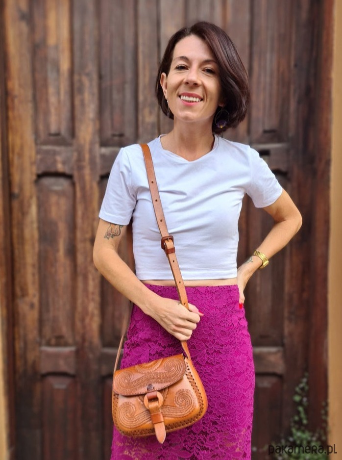 Piękna, ręcznie robiona skórzana torebka. Kształt trapezu oraz bardzo ciekawe wzory sprawiają, że jest unikatowa i rzucająca się w oczy. Ma długi, regulowany pasek, który pozwoli na idealne dopasowanie jej do Twoich potrzeb. Brązowa torebka Abril będzie idealnym dodatkiem do Twoich kreacji.