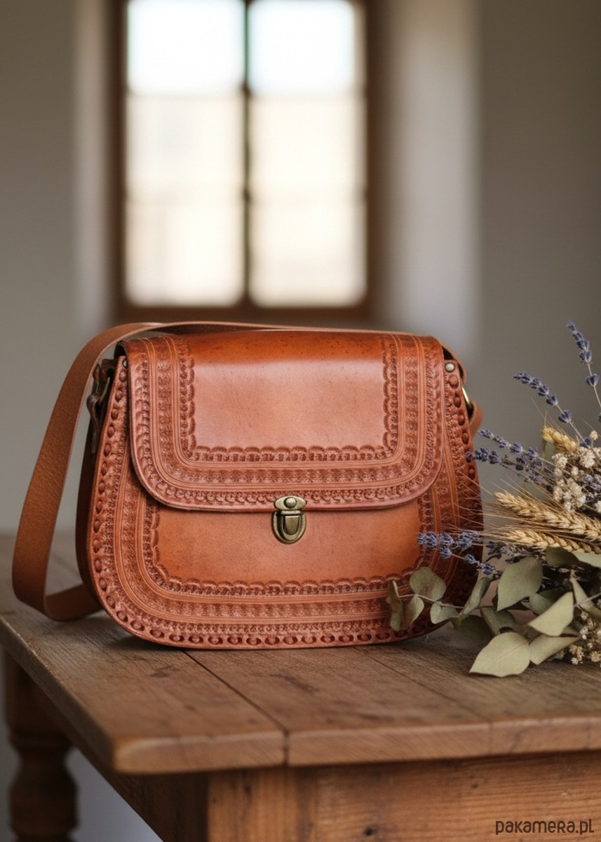 Piękna, torebka wykonana w 100% ręcznie w warsztacie kaletniczym w Meksyku. Torba wykonana jest z grubej skóry juchtowej, która sprawia, że torba będzie służyć przez wiele lat. Wzory na torbie wykonywane są ręcznie za pomocą specjalnych dłut.