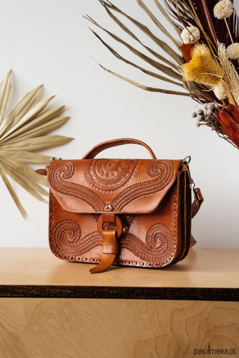 Wzorzysty skórzany kuferek, wykonany ręcznie ze skóry bydlęcej w warsztacie braci Cruz w Meksyku. Charakteryzuje go ciekawy wzór, który odzwierciedla nastrój artysty w dniu kiedy wybijał go na skórze. Kuferek przedzielony jest na dwie spore przegrody. Długi regulowany pasek pozwoli Ci na dopasowanie go do wzrostu, a uchwyt na rękę zmieni w małą klasyczną aktówkę, mieszczącą twój kalendarz i tablet. Ta torba podkreśli Twój styl i poczucie wyjątkowości.