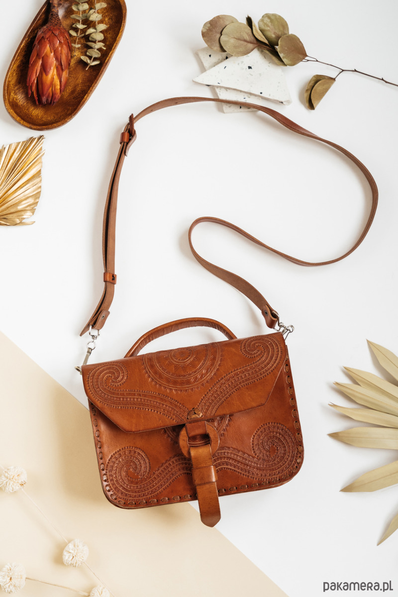 Skóra użyta do wykonania tej torebki jest ręcznie garbowana z zastosowaniem tradycyjnych technik rzemiosła, a barwiona jest naturalnie poprzez ekspozycję skóry na słońcu.