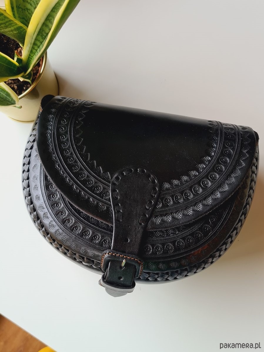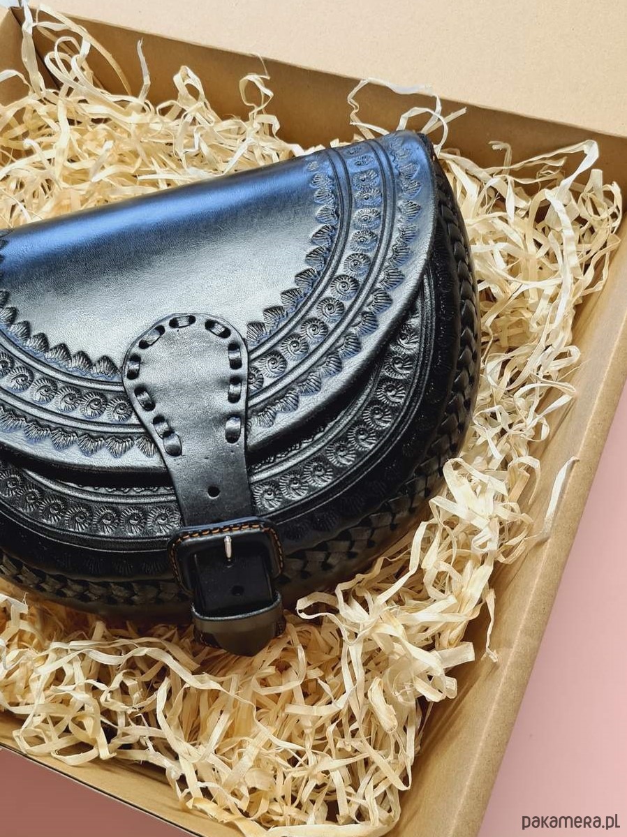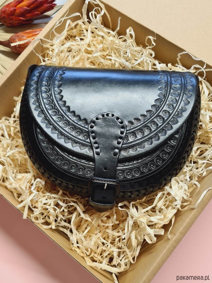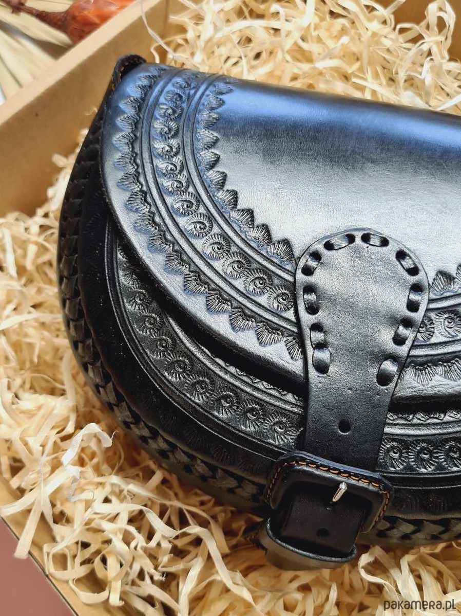Torebka skórzana ręcznie robiona góralska Nicte Czarna wzory zakopane
