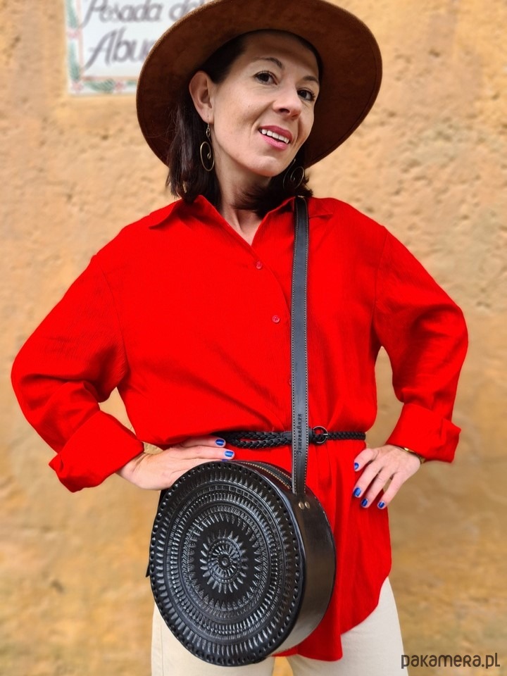 Duża, okrągła i niemniej urocza. Szyk mody tego roku. Starannie wykonana ze skóry naturalnej w zakładzie braci Cruz w Meksyku, zdobiona pięknymi ręcznie tłoczonymi wzorami, które sprawiają, że jak każda nasza torebka, jest unikatem. Mieści aparat fotograficzny oraz najpotrzebniejsze kobiece rzeczy.