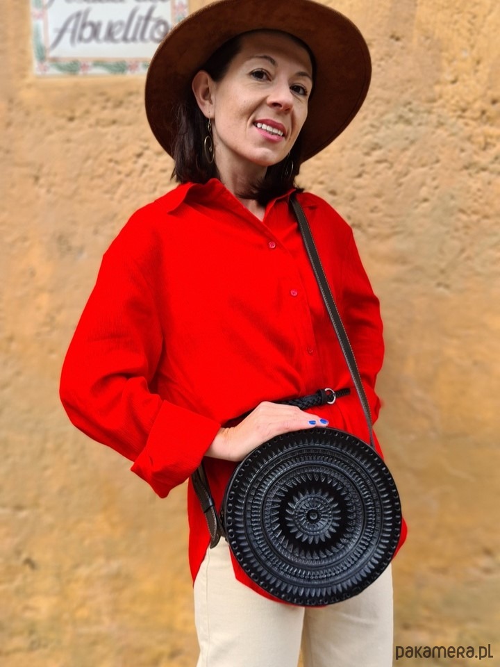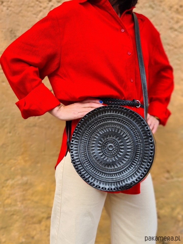 Duża, okrągła i niemniej urocza. Szyk mody tego roku. Starannie wykonana ze skóry naturalnej w zakładzie braci Cruz w Meksyku, zdobiona pięknymi ręcznie tłoczonymi wzorami, które sprawiają, że jak każda nasza torebka, jest unikatem. Mieści aparat fotograficzny oraz najpotrzebniejsze kobiece rzeczy.