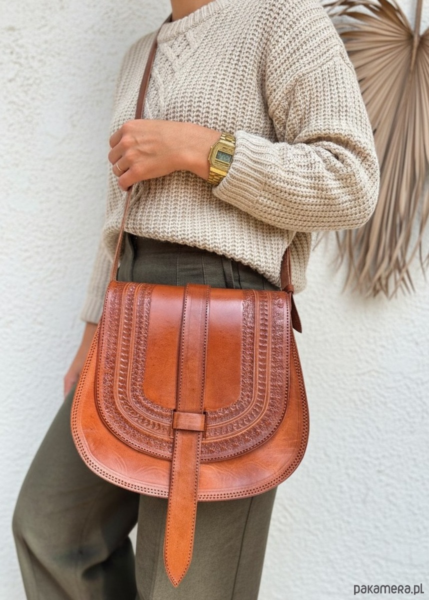 Duża torba skórzana wykonana w 100% ręcznie z grubej skóry juchtowej. Torba to typowa torba listonoszka, może być noszona na ramię lub przez ramię, a materiał, z jakiej została wykonana sprawi, że będziesz mogła cieszyć się nią przez wiele lat. Skóra użyta do wykonania tej torebki jest ręcznie garbowana z zastosowaniem tradycyjnych technik rzemiosła, a barwiona jest naturalnie poprzez ekspozycję skóry na słońcu.