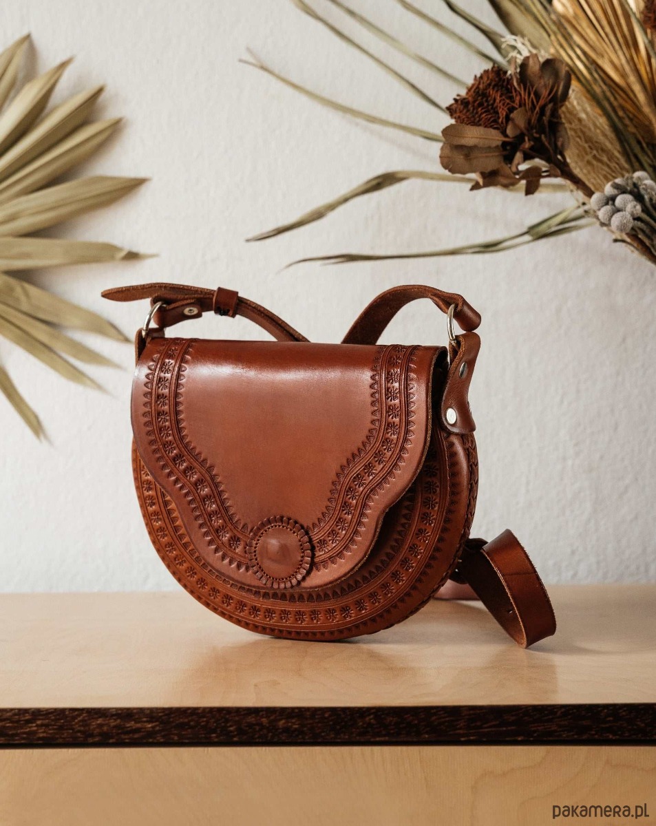 Półokrągła, piękna torebka damska wykonana z najlepszej jakości skóry naturalnej. Unikatowości dodają jej ręcznie wykonane zdobienia.