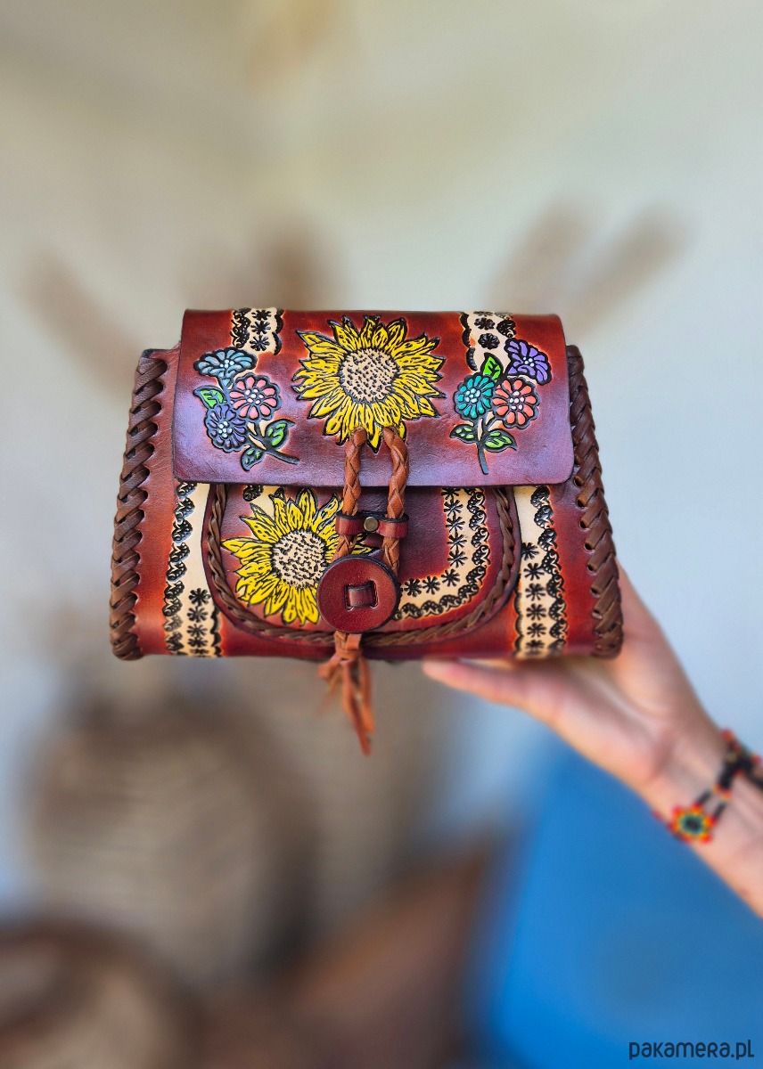 Skóra użyta to wykonania torebki jest ręcznie garbowana oraz ręcznie malowana, a wzory wykonane są za pomocą odpowiednich stempli.