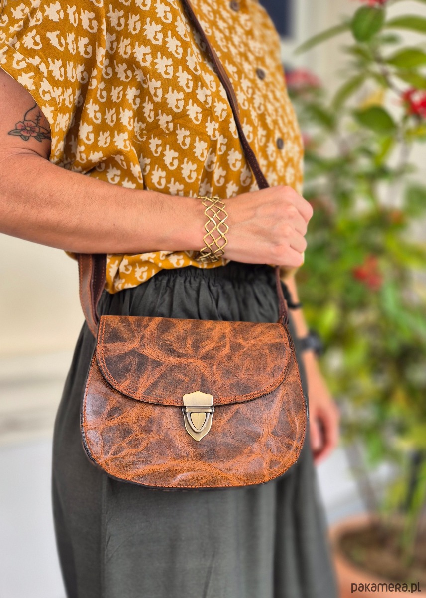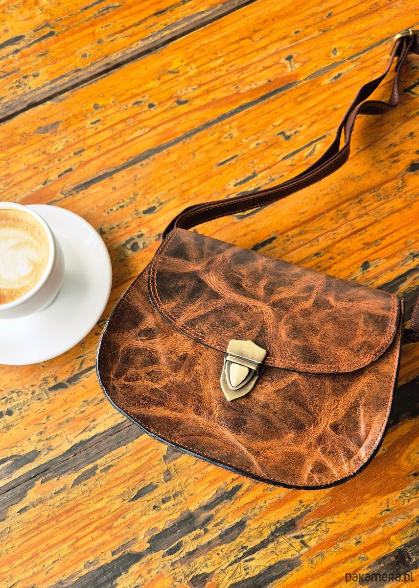 Mała klasyczna torebka ze skóry naturalnej w ciepłym brązowym kolorze. Fason o prostych, eleganckich liniach łączy w sobie szyk i uniwersalność, doskonale pasując do codziennych i wieczorowych stylizacji. Wykończenia są solidne, a starannie szyte krawędzie gwarantują trwałość na długi czas użytkowania. Torebka posiada regulowany pasek, umożliwiający noszenie na ramieniu lub skrzyżnie na tułowie. Wnętrze mieści najpotrzebniejsze rzeczy: portfel, telefon, klucze i drobiazgi w porządku. Zapięcie na magnes zapewnia szybki dostęp przy jednoczesnej ochronie zawartości. Uniwersalny brązowy odcień czyni torebkę łatwą do dopasowania do wielu kolorów garderoby, dodając szyku każdej stylizacji.