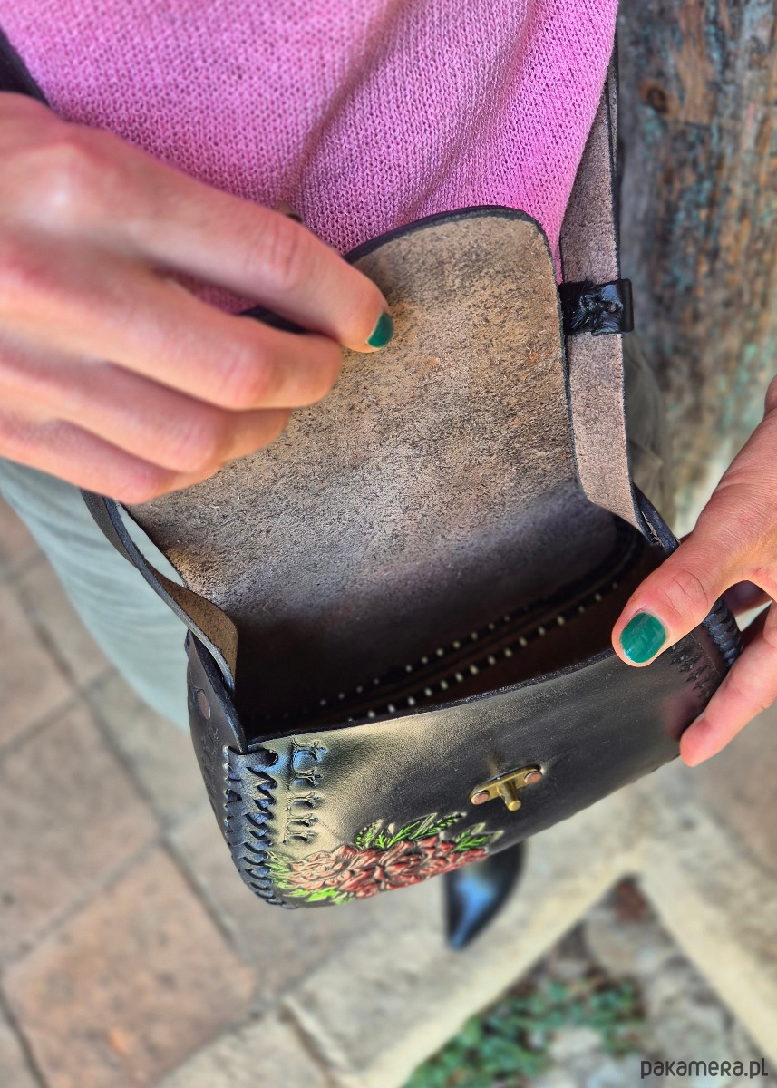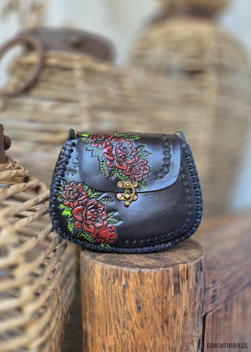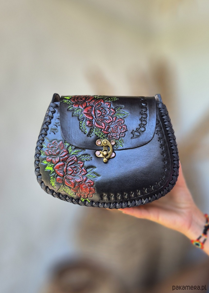 Skóra użyta to wykonania torebki jest ręcznie garbowana oraz ręcznie malowana, a wzory wykonane są za pomocą odpowiednich stempli.