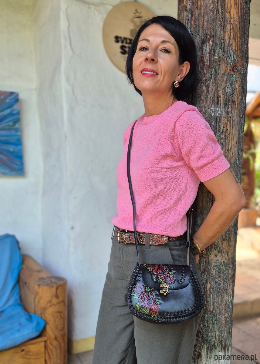 Skórzana torebka, ręcznie wykonana w Meksyku z grubej skóry naturalnej. Jej unikalny design zdobią wzory z motywem kwiatowym, które nadają jej niepowtarzalny styl i charakter. Każdy detal torebki został starannie wykonany przez doświadczonych rzemieślników, co sprawia, że jest ona nie tylko pięknym, ale także trwałym dodatkiem do garderoby. Wykorzystanie skóry naturalnej gwarantuje, że torebka będzie służyć przez wiele lat, zachowując swój wyjątkowy wygląd. Jej elegancki design sprawia, że doskonale sprawdzi się jako dodatek zarówno do codziennych stylizacji, jak i na wyjątkowe okazje. Ta torebka to nie tylko praktyczny element garderoby, ale również wyraz artystycznego kunsztu meksykańskich rzemieślników, którzy tworząc ją, przelewają w nią swoją pasję i tradycje.