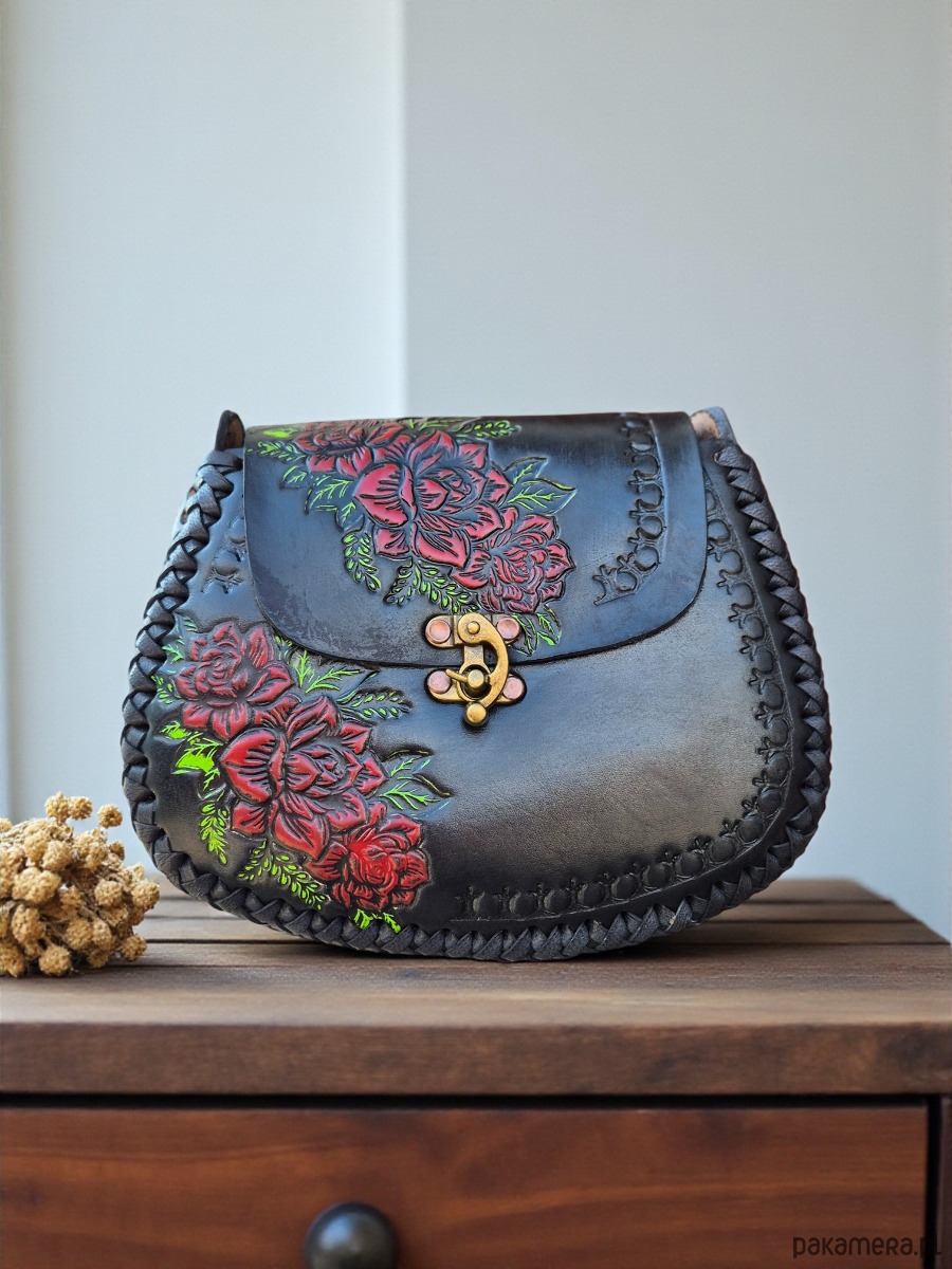 Skóra użyta to wykonania torebki jest ręcznie garbowana oraz ręcznie malowana, a wzory wykonane są za pomocą odpowiednich stempli.