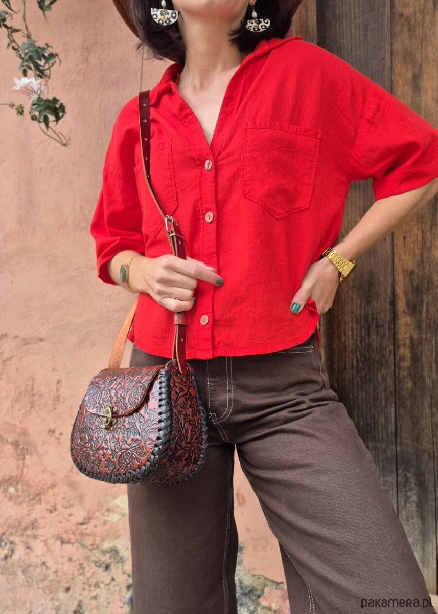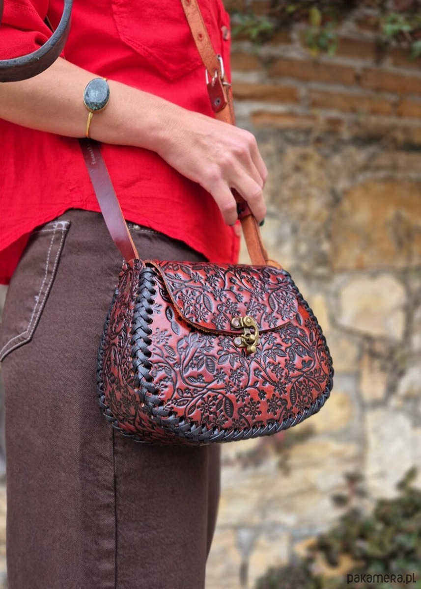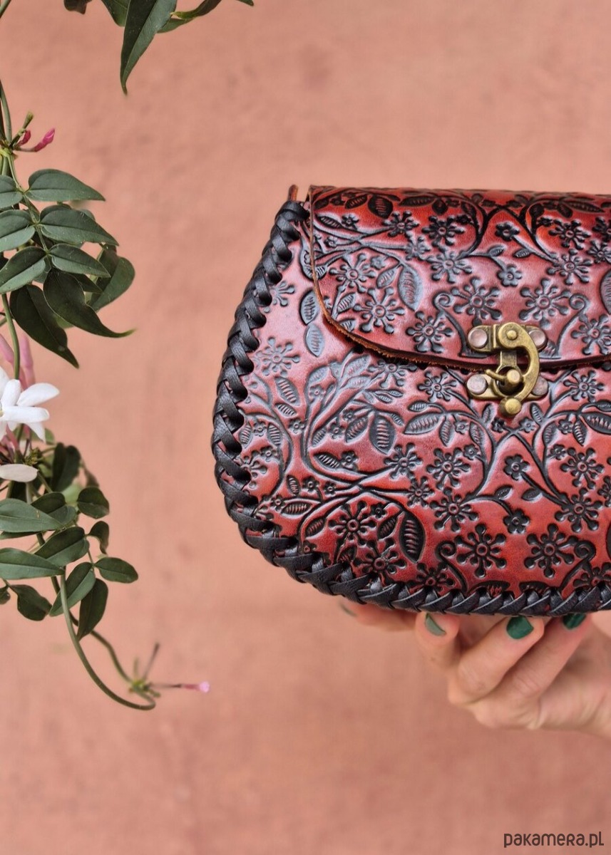 Skórzana torebka, ręcznie wykonana w Meksyku z grubej skóry naturalnej. Jej unikalny design zdobią wzory z motywem kwiatowym, które nadają jej niepowtarzalny styl i charakter. Każdy detal torebki został starannie wykonany przez doświadczonych rzemieślników, co sprawia, że jest ona nie tylko pięknym, ale także trwałym dodatkiem do garderoby. Wykorzystanie skóry naturalnej gwarantuje, że torebka będzie służyć przez wiele lat, zachowując swój wyjątkowy wygląd. Jej elegancki design sprawia, że doskonale sprawdzi się jako dodatek zarówno do codziennych stylizacji, jak i na wyjątkowe okazje. Ta torebka to nie tylko praktyczny element garderoby, ale również wyraz artystycznego kunsztu meksykańskich rzemieślników, którzy tworząc ją, przelewają w nią swoją pasję i tradycje.