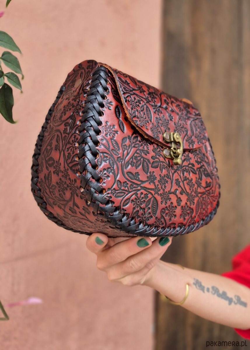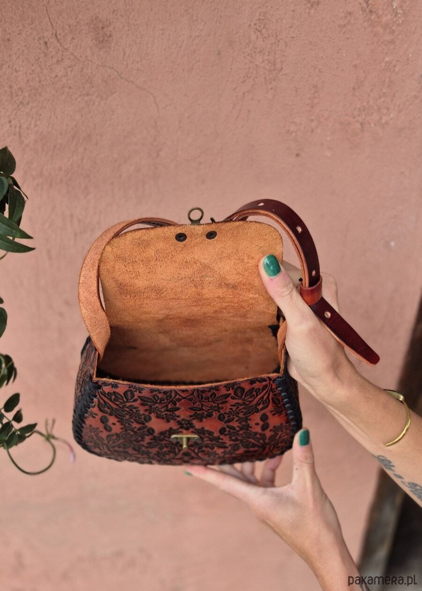 Skóra użyta to wykonania torebki jest ręcznie garbowana oraz ręcznie malowana, a wzory wykonane są za pomocą odpowiednich stempli.
