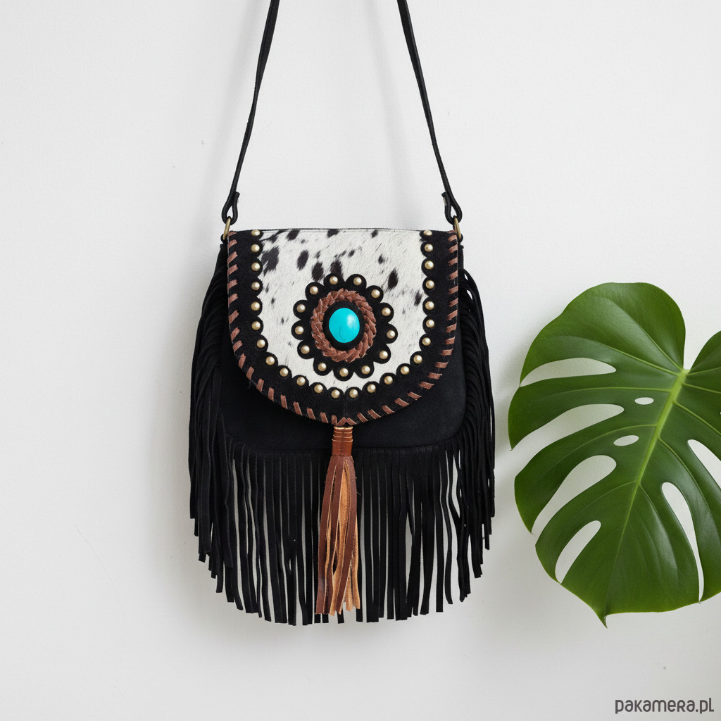 Ręcznie robiona torebka z grubej skóry zamszowej, ozdobiona frędzlami i naturalnym włosiem z łatami. Każdy egzemplarz wykonany jest z dbałością o szczegóły, co nadaje mu wyjątkową trwałość i charakter. Zamszowa faktura skóry dodaje subtelnego, eleganckiego wyglądu oraz miękkości w dotyku. Frędzle tworzą dynamiczny efekt ruchu, przyciągający uwagę i podkreślający casualowy styl. Naturalne włosie dodaje oryginalności oraz nietuzinkowego akcentu, podkreślając rękodzielniczy charakter produktu. Torba jest funkcjonalna, mieści niezbędne drobiazgi, a jednocześnie prezentuje się lekko i modnie. Produkt ręcznie wykonany, co gwarantuje wysoką jakość rzemiosła i unikatowość każdej sztuki.