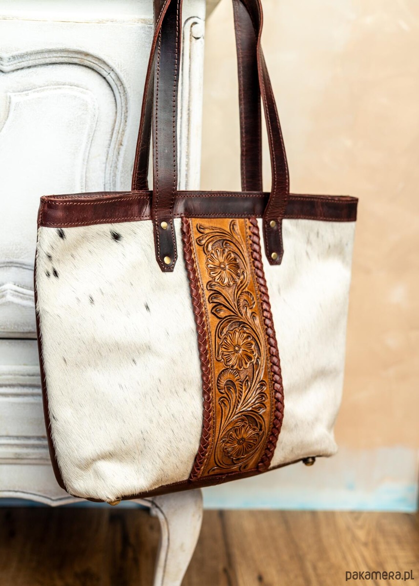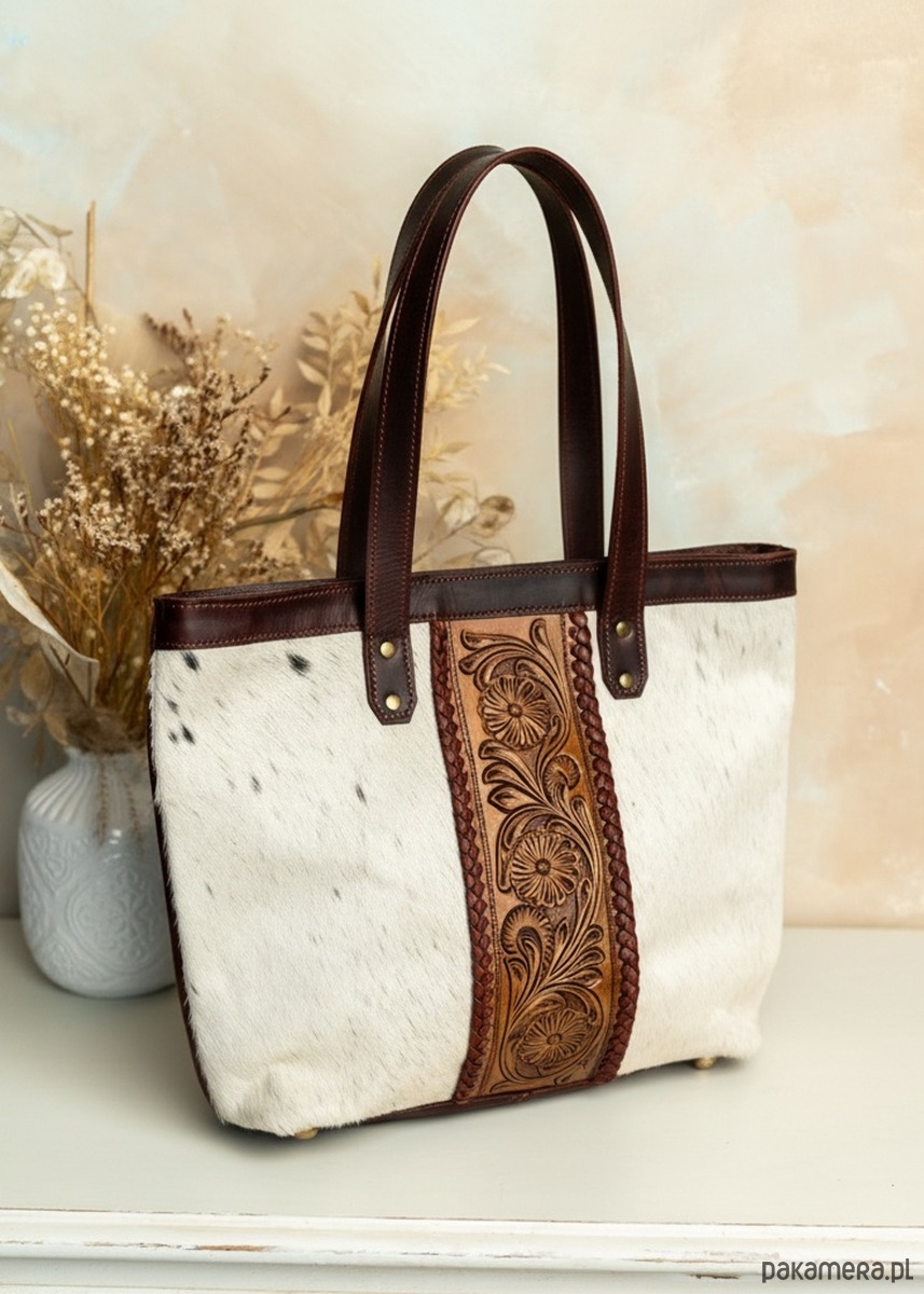 Duża i pojemna torebka wykonana ze skóry z naturalnym włosiem prezentuje eleganckie, luksusowe wykończenie. Zdobiona jest misternym rzeźbieniem w skórze, które nadaje jej unikalny charakter i wyrafinowaną fakturę. Dzięki solidnej konstrukcji i wysokiej jakości materiałów, torebka łączy trwałość z wyraźnym stylem. Naturalne włosie dodaje jej mistycznego uroku i subtelnego połysku, który przyciąga spojrzenia. Smukłe, starannie wykończone detale podkreślają precyzję wykonania. Wnętrze zaprojektowano z myślą o funkcjonalności, mieszczące najważniejsze akcesoria w organizowanych kieszeniach. Całość tworzy ponadczasowy dodatek, idealny do codziennych stylizacji oraz bardziej formalnych looków.