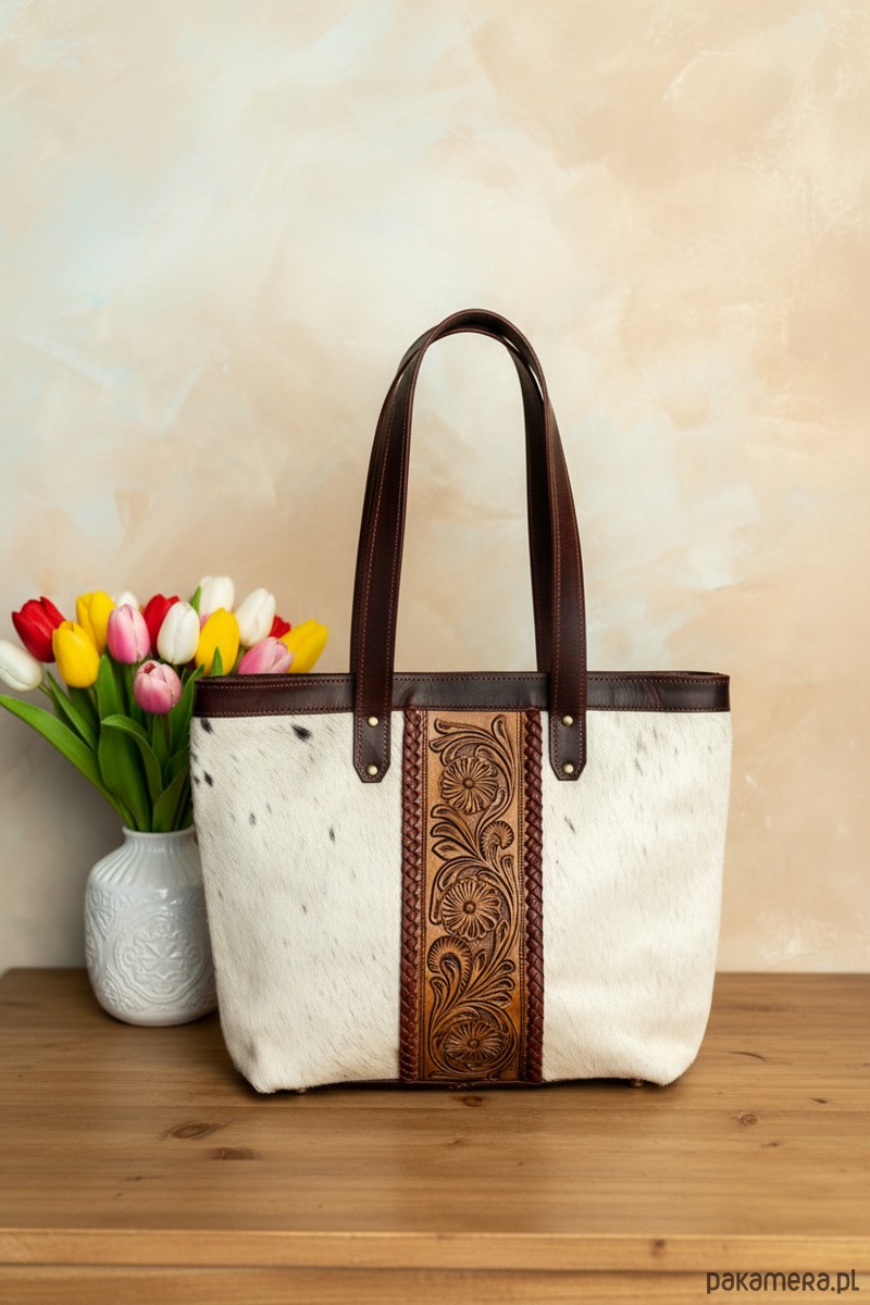 Duża i pojemna torebka wykonana ze skóry z naturalnym włosiem prezentuje eleganckie, luksusowe wykończenie. Zdobiona jest misternym rzeźbieniem w skórze, które nadaje jej unikalny charakter i wyrafinowaną fakturę. Dzięki solidnej konstrukcji i wysokiej jakości materiałów, torebka łączy trwałość z wyraźnym stylem. Naturalne włosie dodaje jej mistycznego uroku i subtelnego połysku, który przyciąga spojrzenia. Smukłe, starannie wykończone detale podkreślają precyzję wykonania. Wnętrze zaprojektowano z myślą o funkcjonalności, mieszczące najważniejsze akcesoria w organizowanych kieszeniach. Całość tworzy ponadczasowy dodatek, idealny do codziennych stylizacji oraz bardziej formalnych looków.