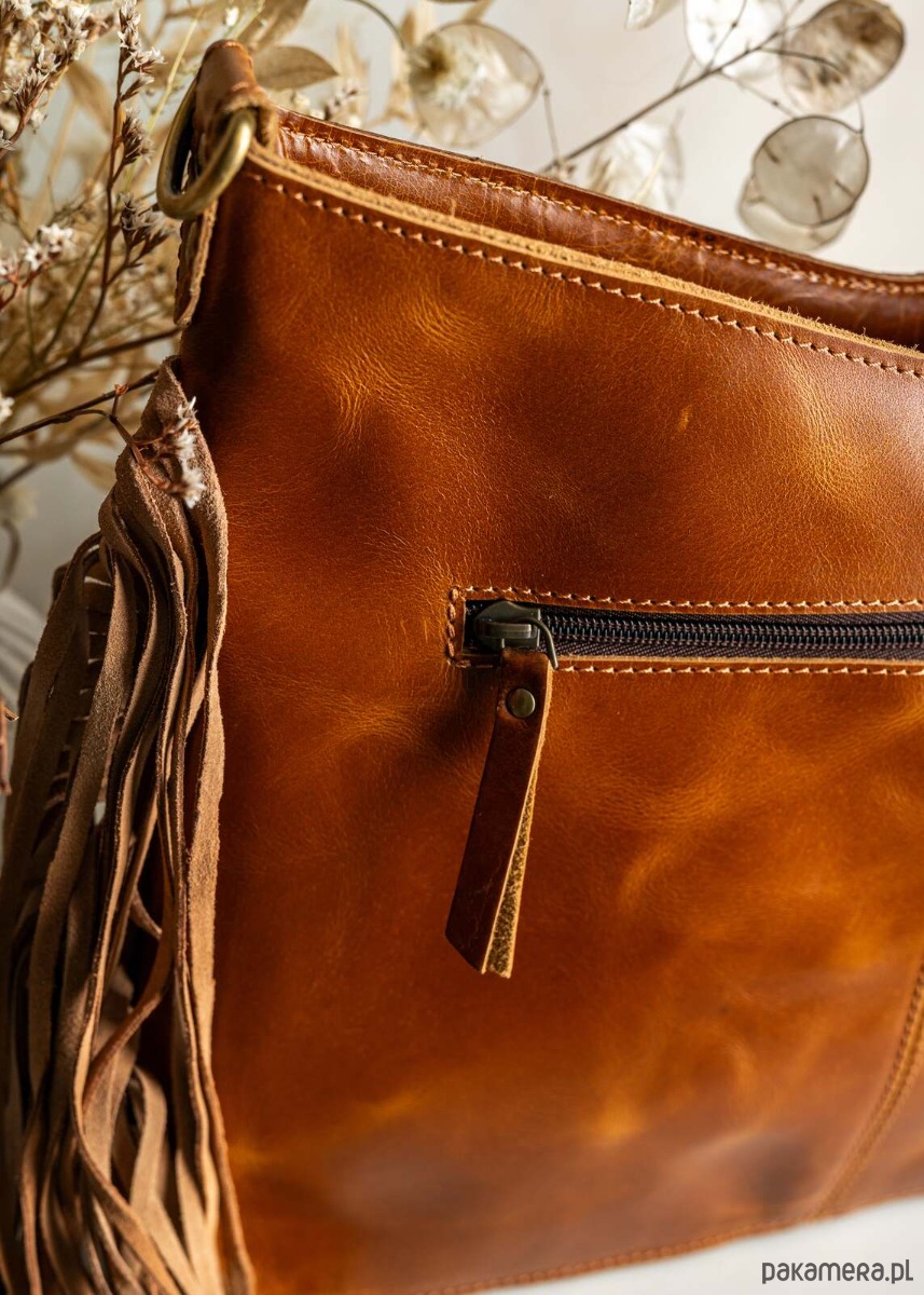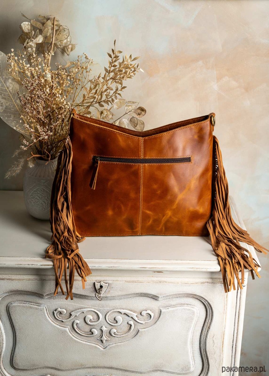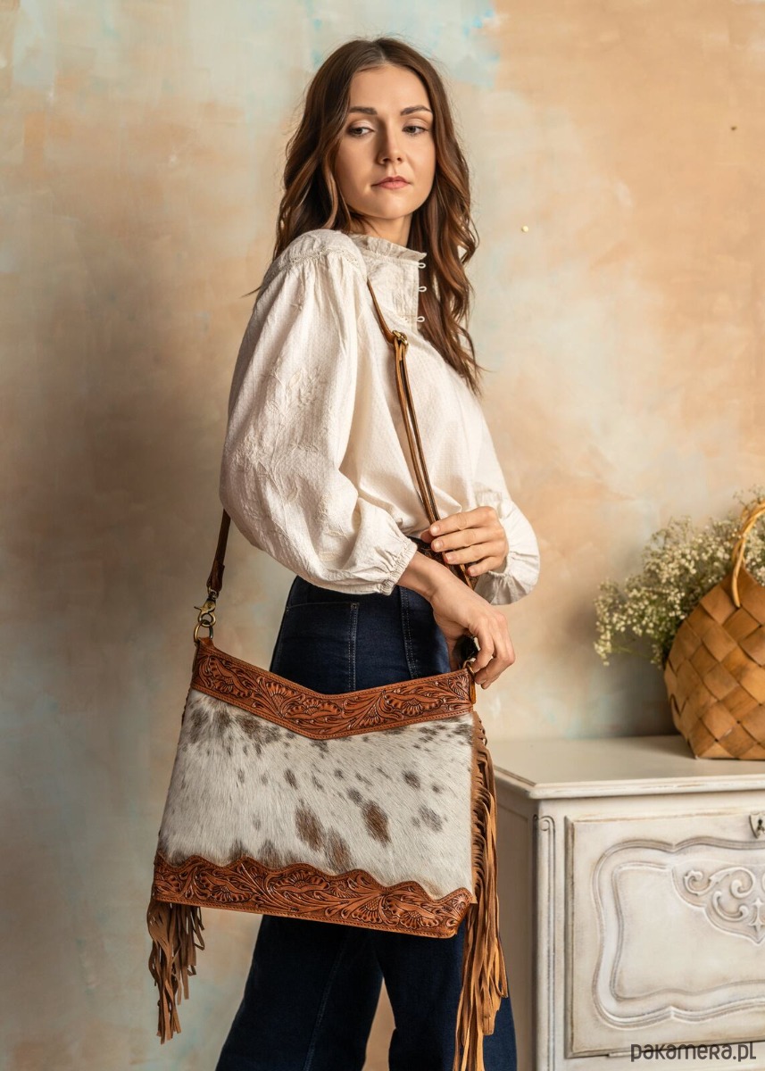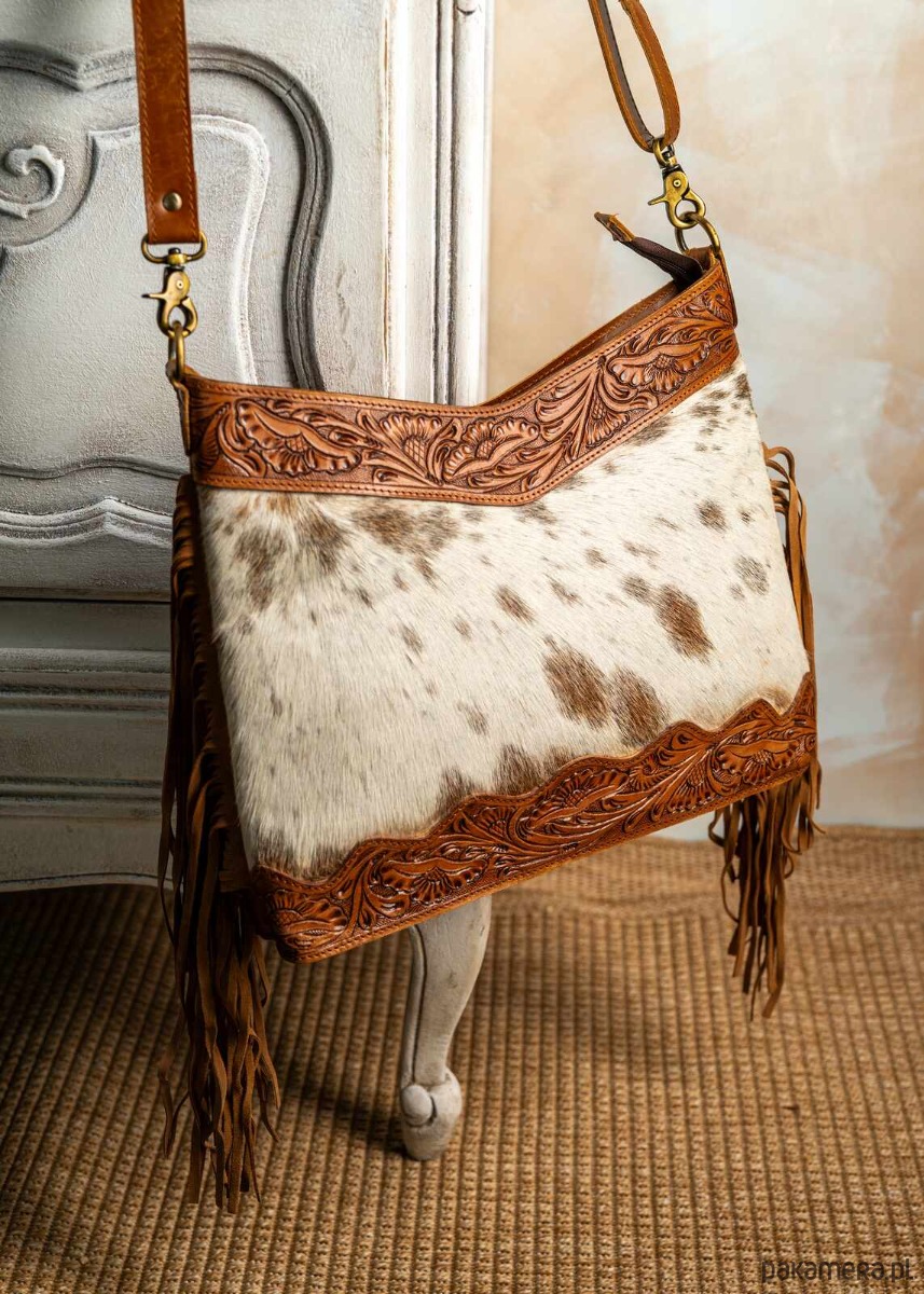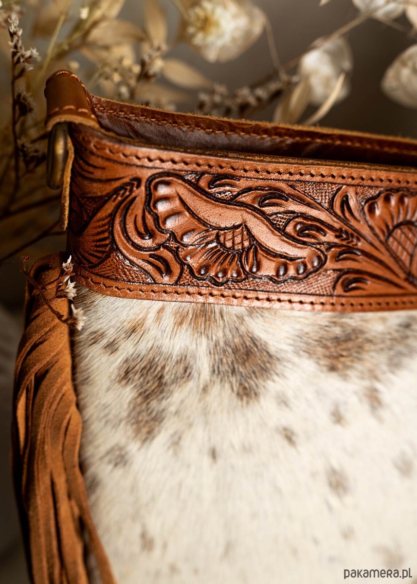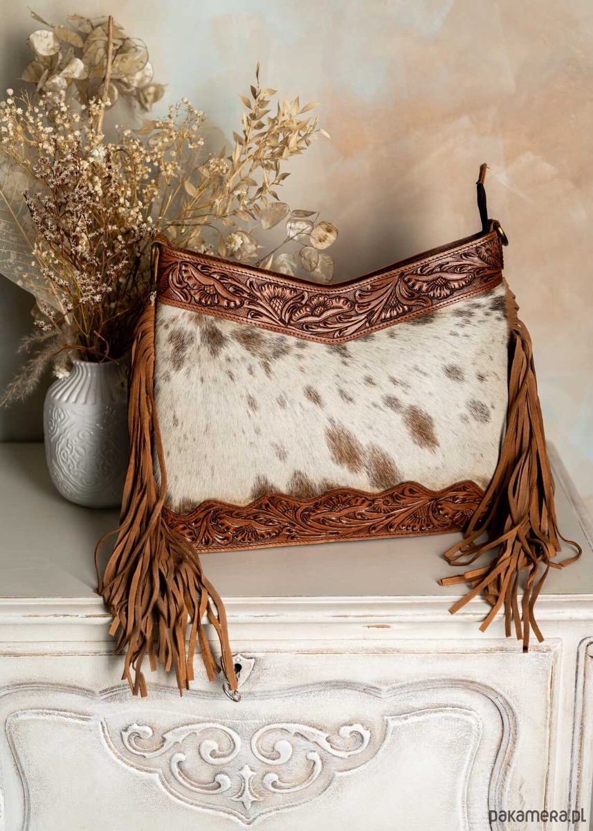 Torebka wykonana w Indiach ze skóry naturalnej zdobiona rzeźbieniem w skórze, naturalnym włosiem oraz frędzlami po bokach, co nadaje jej wyjątkowy, artystyczny charakter. Materiał wysokiej jakości gwarantuje trwałość i elegancki wygląd na lata. Frędzle po bokach dodają torbie lekko boho stylu oraz ruchomość przy każdym kroku. Wnętrze zaprojektowano z myślą o funkcjonalności, mieszcząc niezbędne drobiazgi przy zachowaniu kompaktowego profilu. Torba doskonale sprawdzi się zarówno w codziennych, jak i wieczorowych stylizacjach dzięki uniwersalnej kolorystyce. To doskonały wybór dla osób ceniących rękodzieło, autentyczny charakter i wysoką jakość skórzanych dodatków.