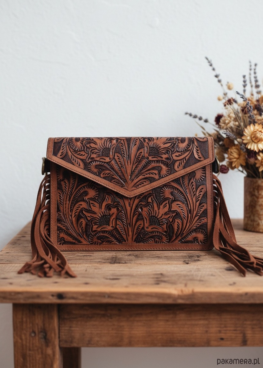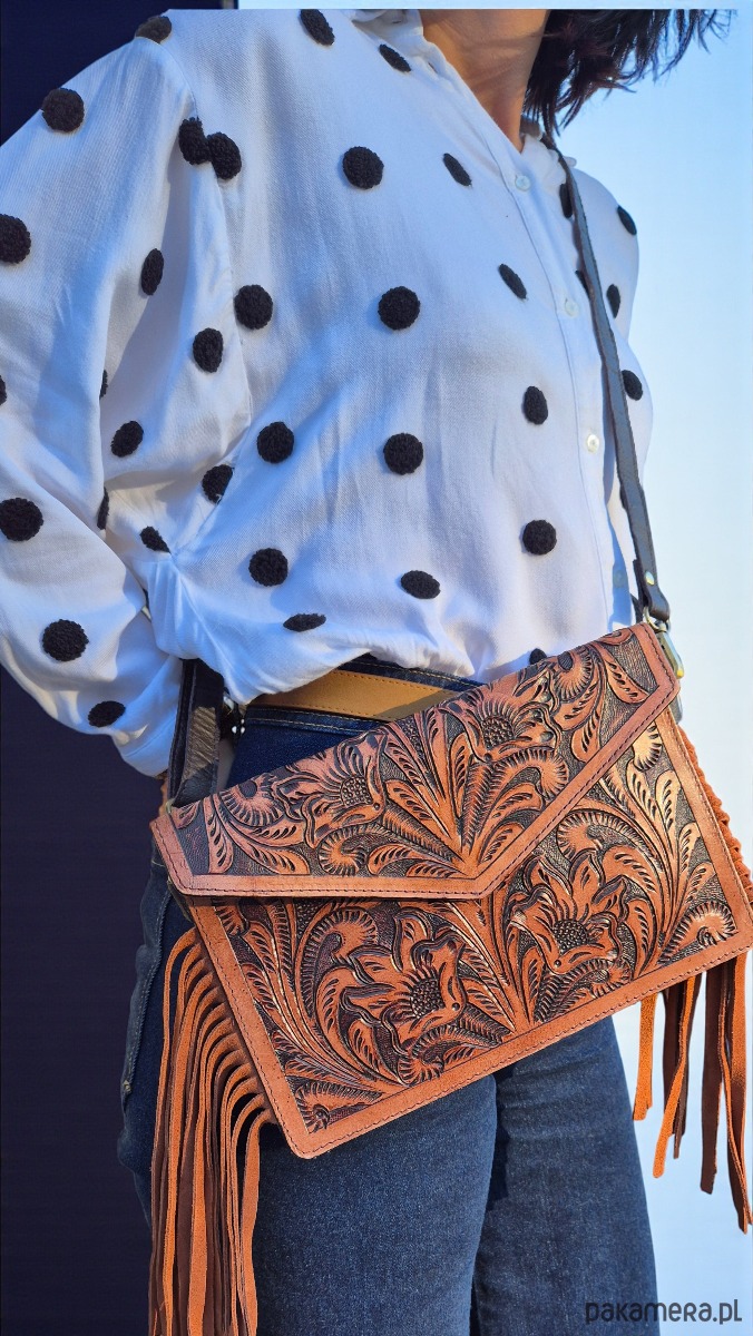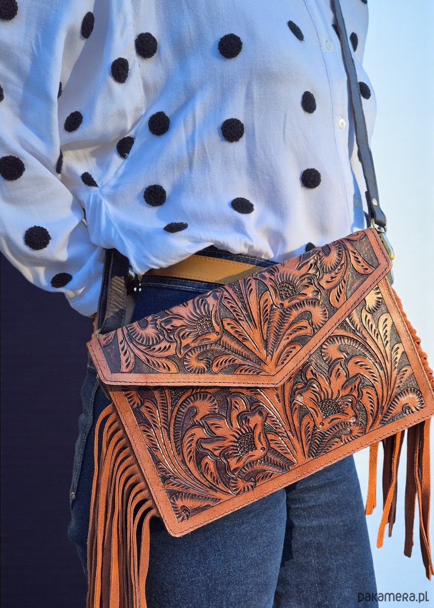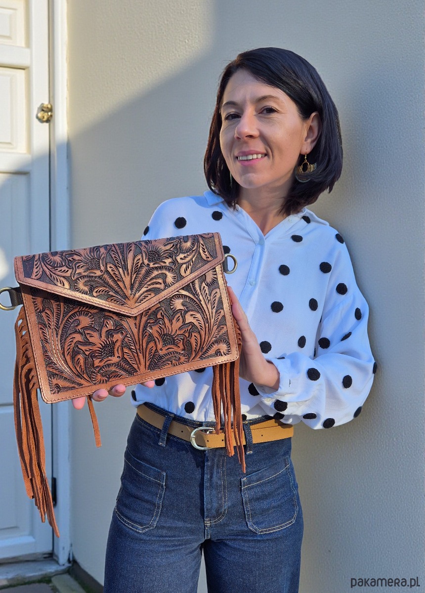 Ręcznie robiona torebka skórzana zdobiona rzeźbieniem w skórze, które nadaje jej wyjątkowy, artystyczny charakter. Torebka posiada odpinany pasek. Wykonana z wysokiej jakości skóry zapewnia trwałość i elegancki wygląd na lata. Zdobienie rzeźbione w detalach podkreśla niezwykły charakter torby. Wnętrze torby zaprojektowano tak, aby mieściło niezbędne drobiazgi, a jednocześnie zachowało kompaktowy profil. Dzięki uniwersalnej kolorystyce torba świetnie komponuje się z casualowymi i eleganckimi stylizacjami. Idealny wybór dla osób ceniących rękodzieło, praktyczność i wyjątkowy design.