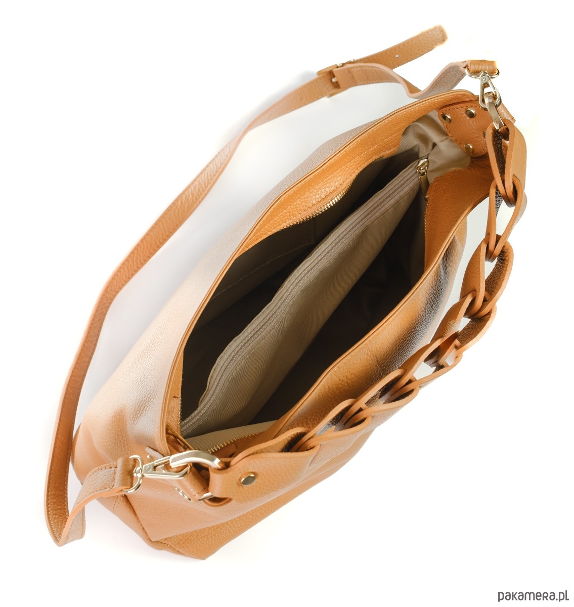 Elegancki, pleciony pasek na ramię, dopinany pasek o dł. 125 cm Mieści format A4.