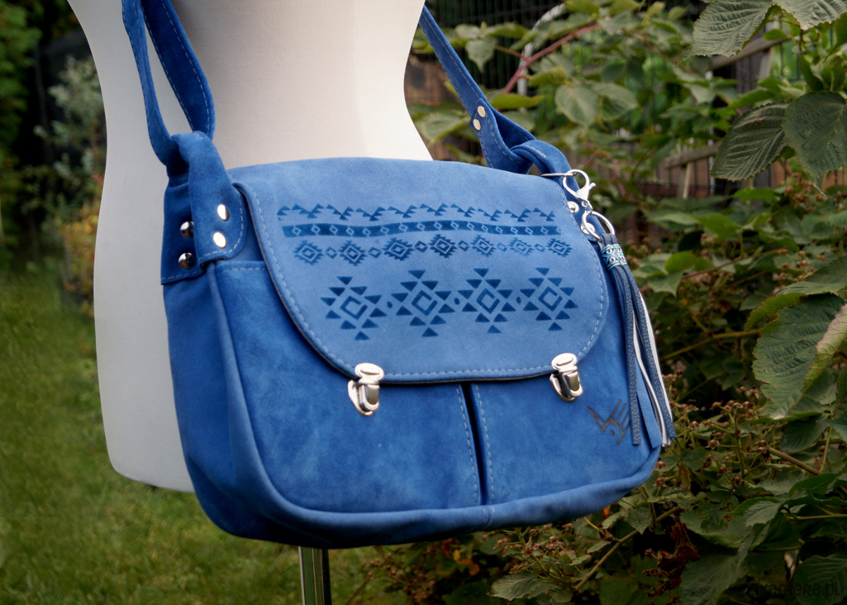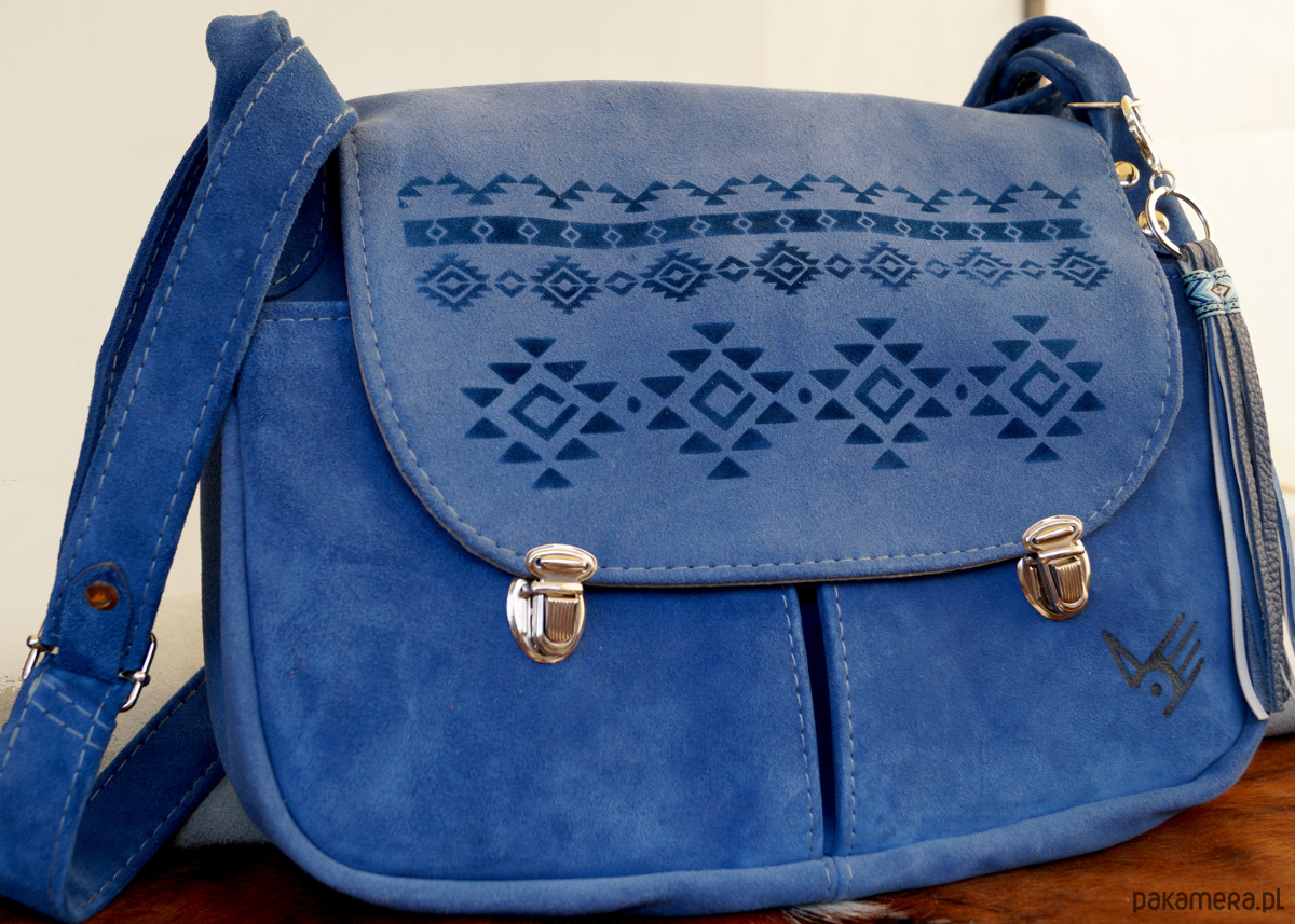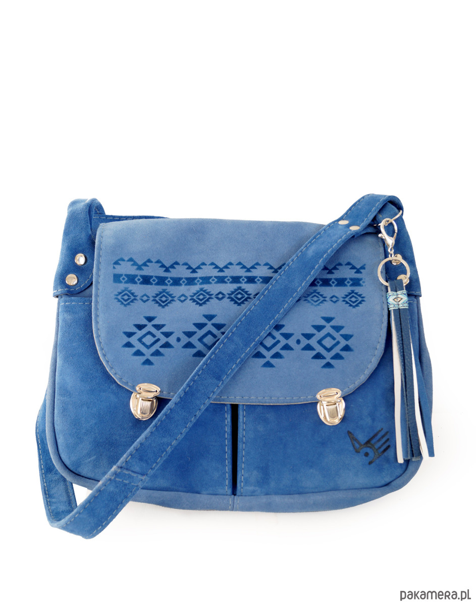 Torebka skórzana USZATY WŁÓCZYKIJ niebieski zamsz AZTECKIE WZORY