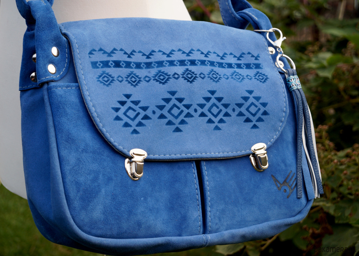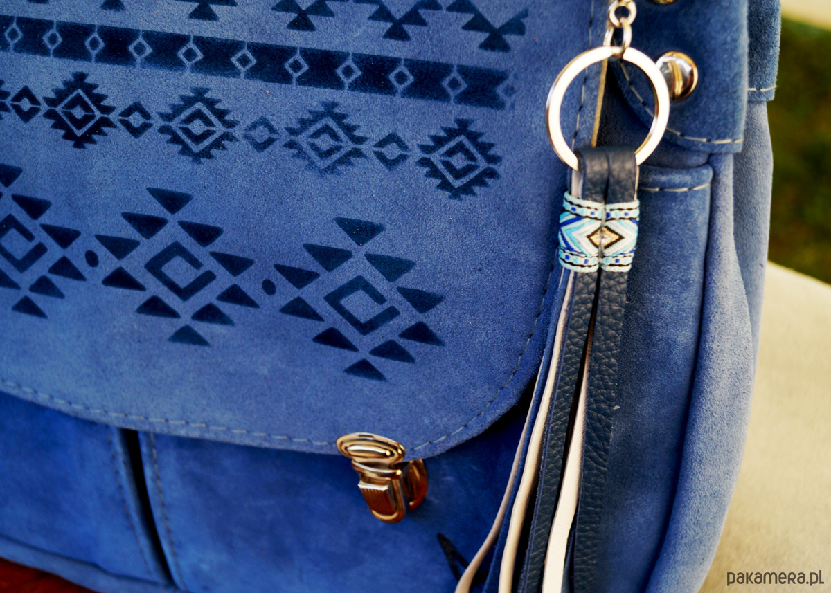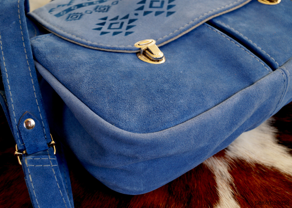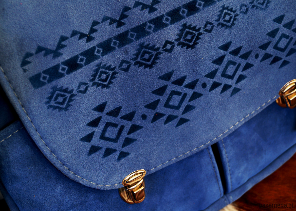 Torebka skórzana USZATY WŁÓCZYKIJ niebieski zamsz AZTECKIE WZORY