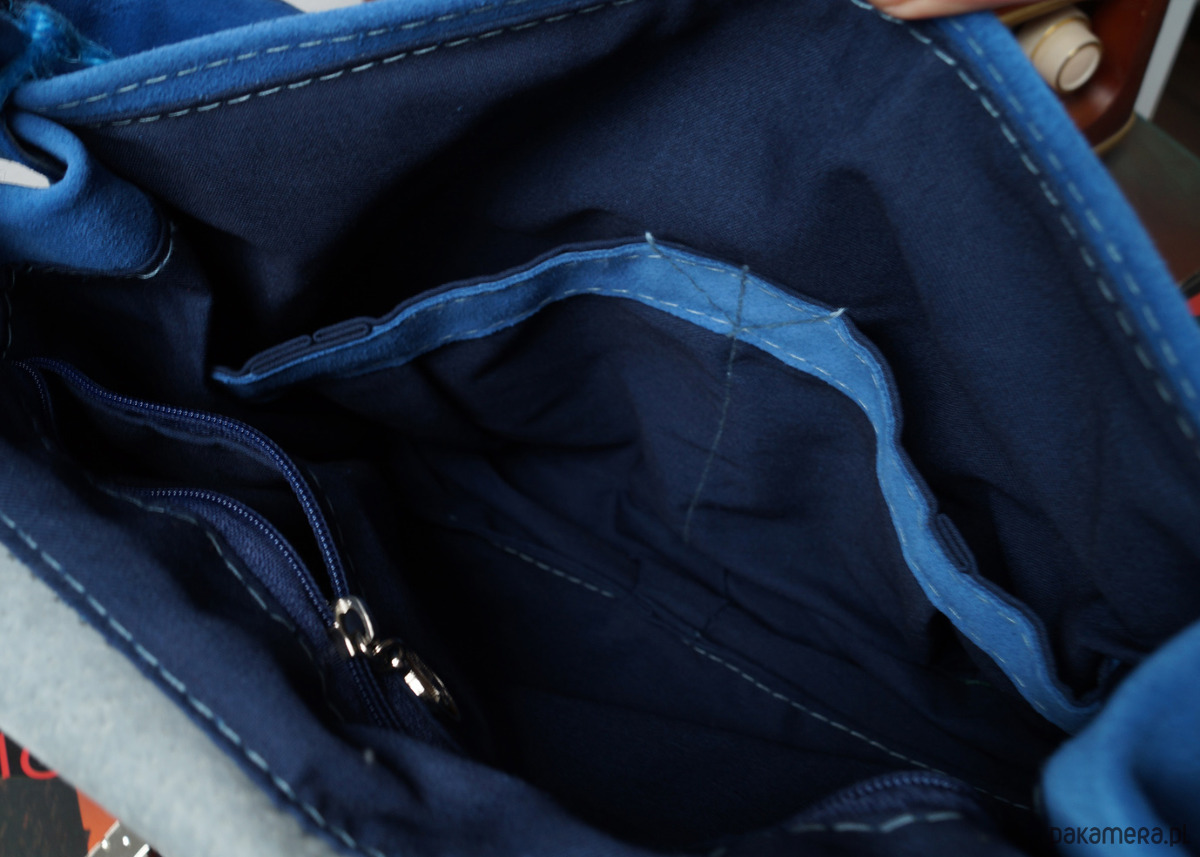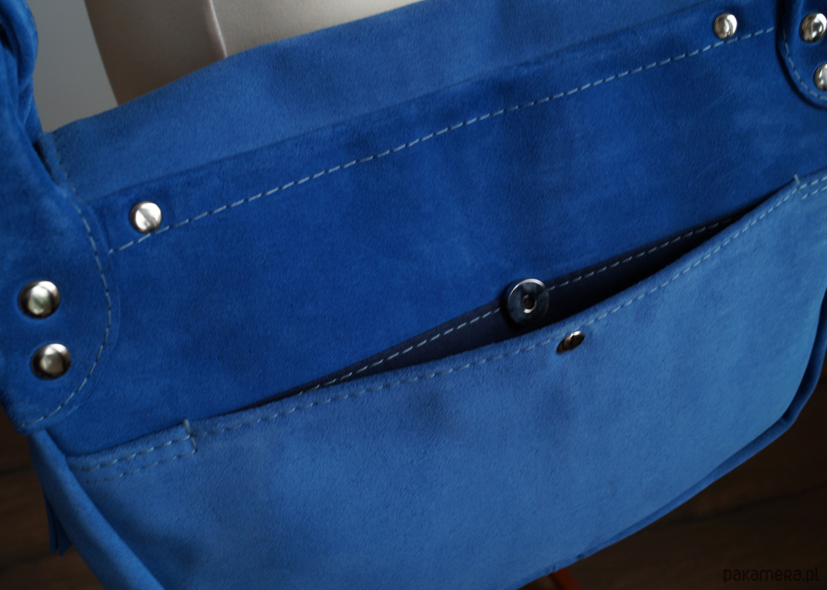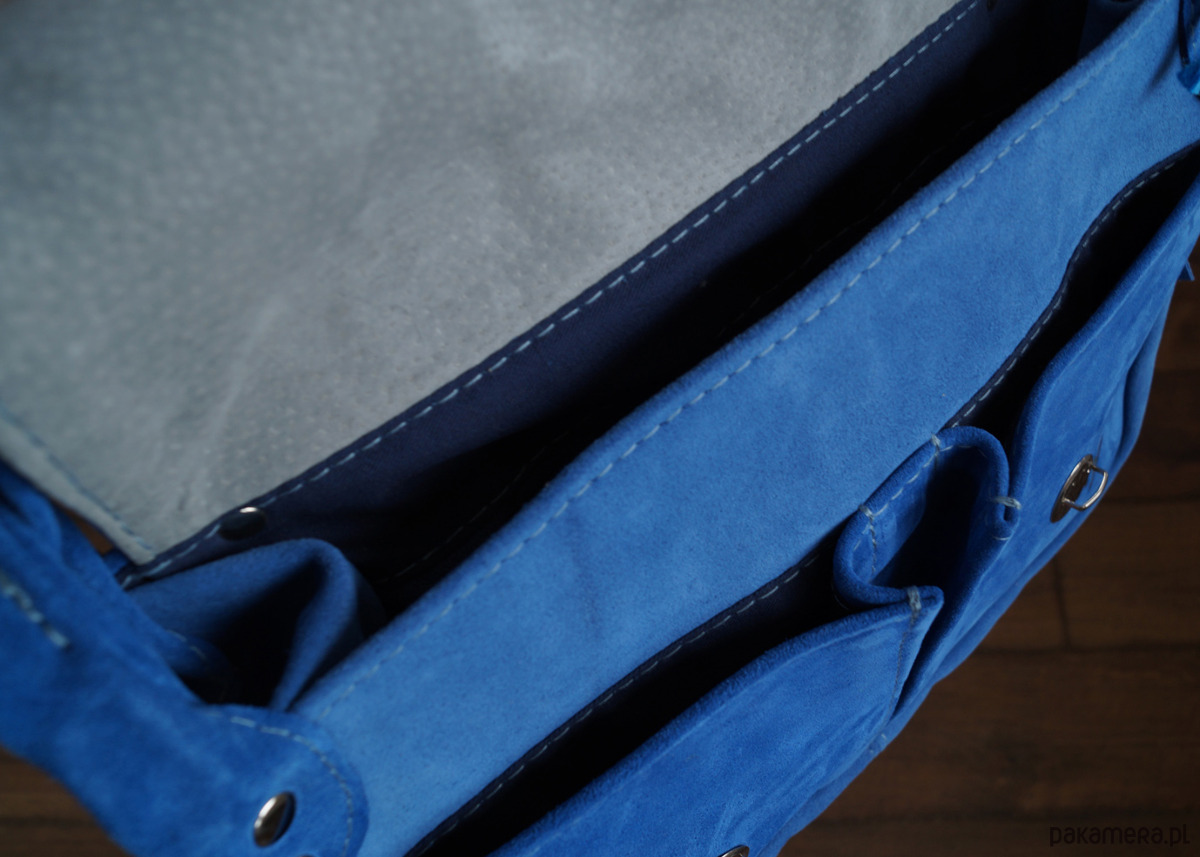 Pojemna, wygodna, wielozadaniowa torba ze świetnej jakości skóry naturalnej, zamszowej, błękitno-niebieskiej. Na klapie ręcznie malowany motyw etnicznych wzorów. Mocna i wytrzymała. Swobodnie mieści format A4, posiada dużo kieszeni i przegród. Szerokość 34, wysokość 25, głębokość ok. 10 cm. Regulowany pasek, długi max na 130cm.